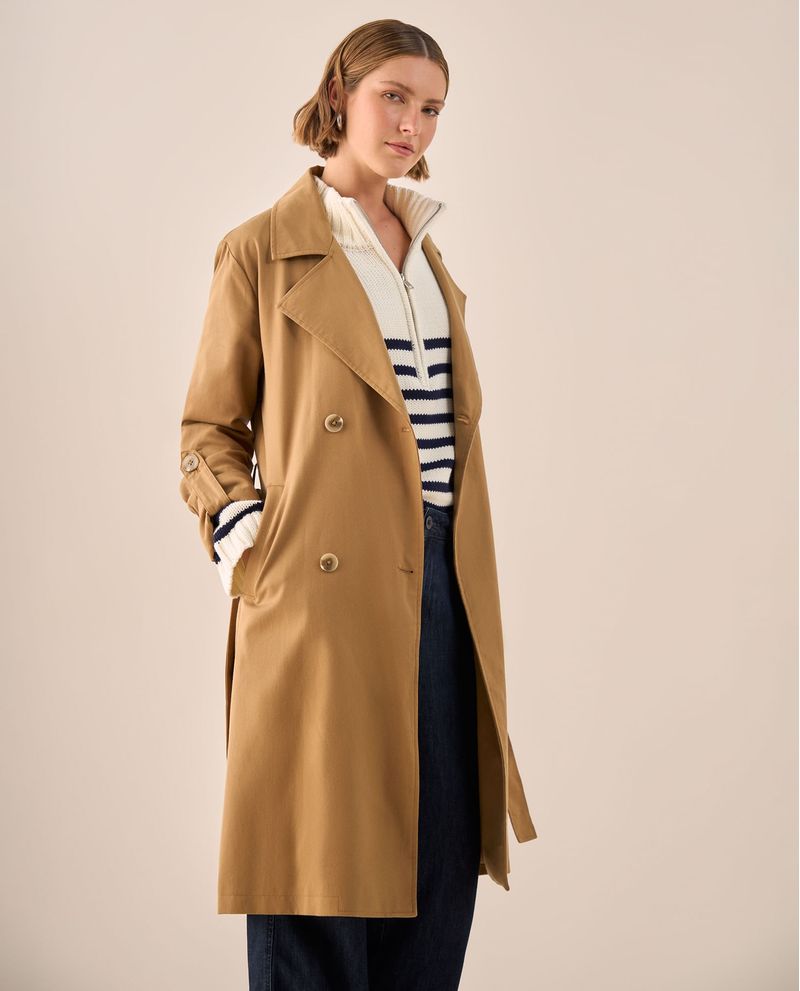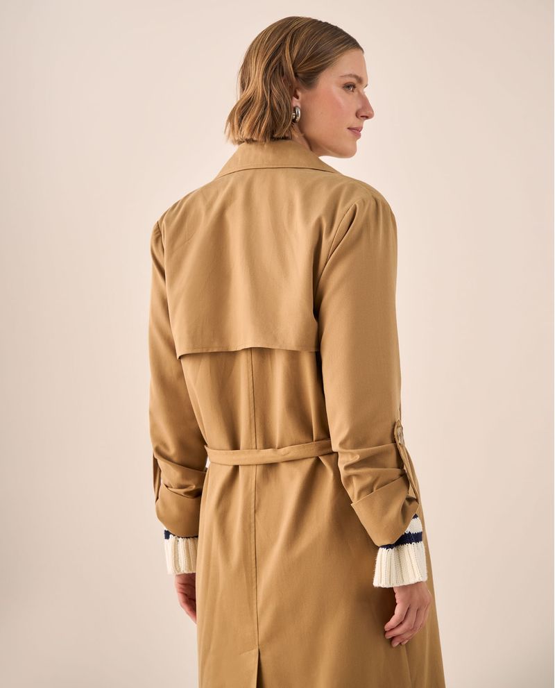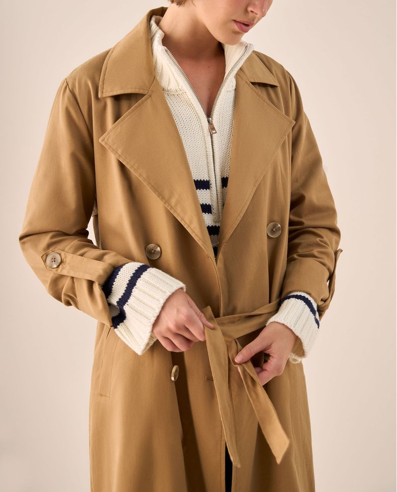 Abrigo café siena medio con doble botonadura y cinturón ajustable que combina la suavidad del algodón con la fluidez del tencel, mientras que su corte trench clásico se adapta desde reuniones de trabajo hasta cenas casuales. Su peso liviano lo convierte en el compañero ideal para entretiempo, manteniendo elegancia sin sacrificar comodidad durante todo el día.