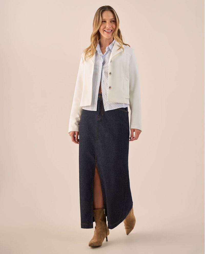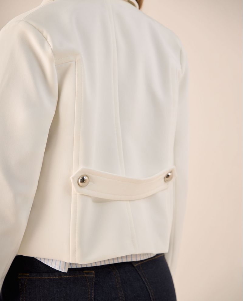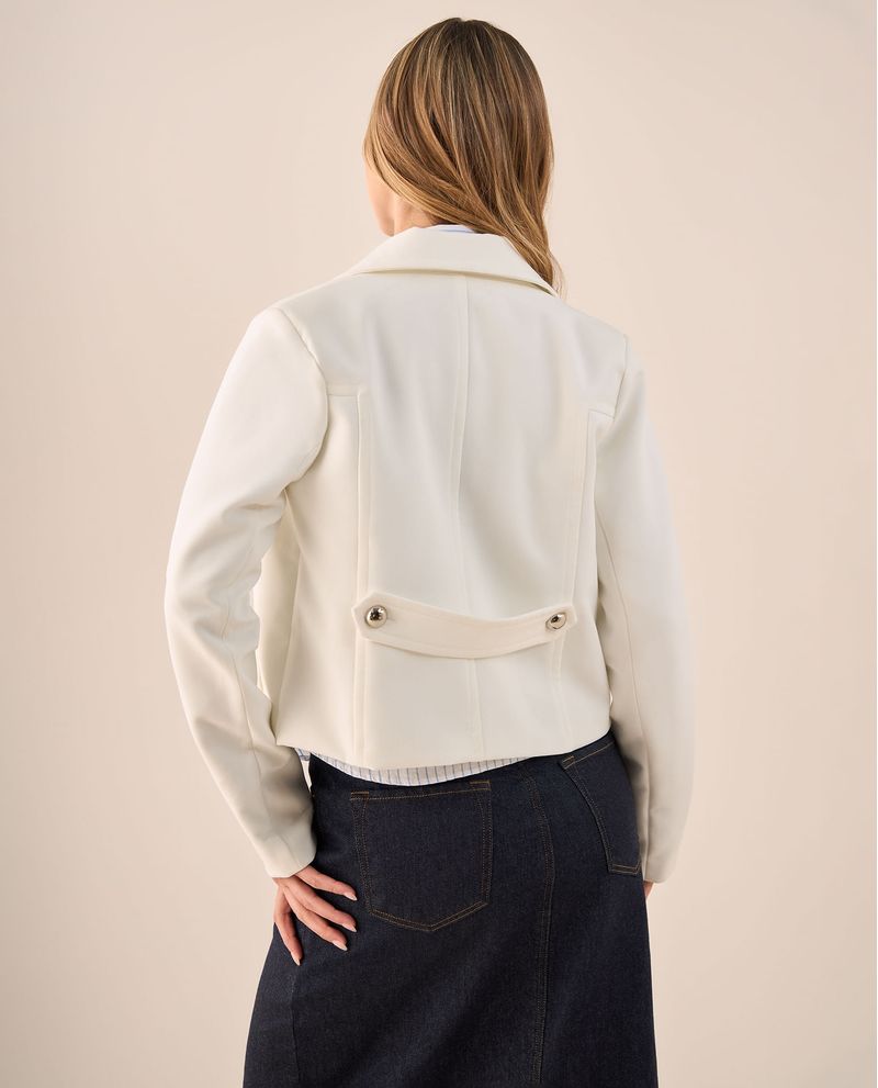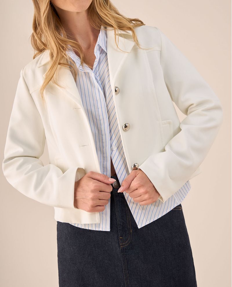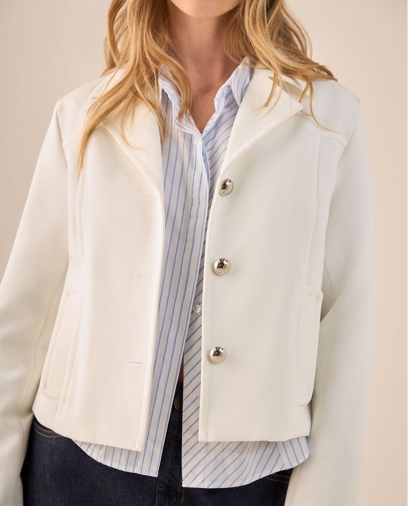 Blazer blanco en tono ponche claro con botones metálicos dorados que aportan sofisticación a cualquier conjunto. Su corte estructurado y líneas limpias crean una silueta refinada, mientras que su diseño minimalista lo convierte en la base perfecta para múltiples looks profesionales y casuales elegantes.
