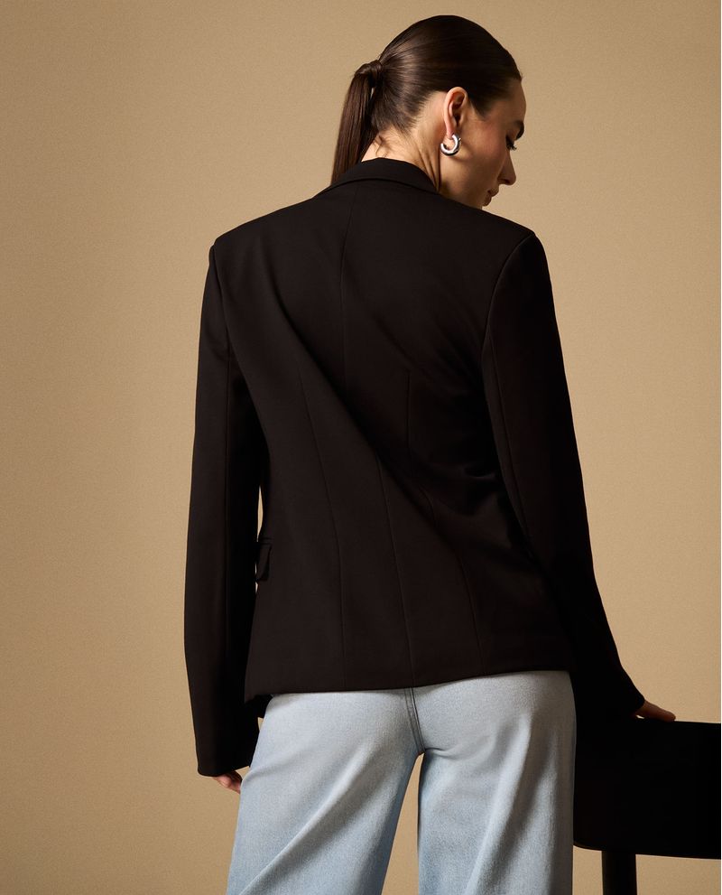 Corte regular estructurado que sienta bien en diferentes tipos de cuerpo, con solapas clásicas que estilizan el escote y mangas largas que terminan en el punto exacto de la muñeca.
