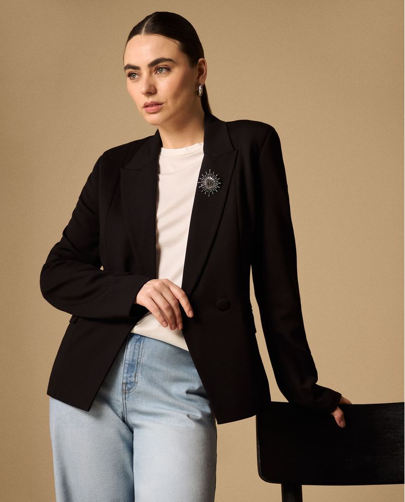 Blazer negro con broche solar metálico que añade personalidad a tu look profesional, gracias a su corte estructurado y forro completo que mantiene la forma impecable. Su diseño atemporal lo convierte en la pieza clave para reuniones importantes, eventos formales y cenas elegantes donde necesitas proyectar confianza sin esfuerzo.
