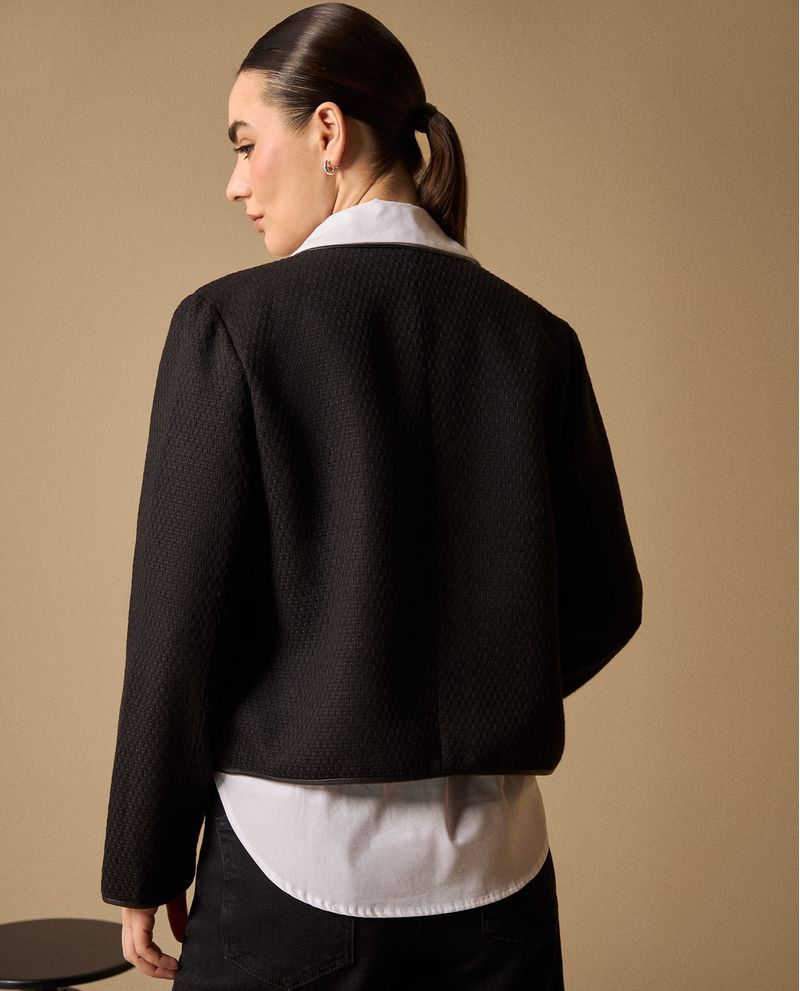 Su textura bouclé suave al tacto contrasta con la estructura firme que mantiene la silueta definida, mientras que el forro interior desliza cómodamente sobre cualquier prenda base.