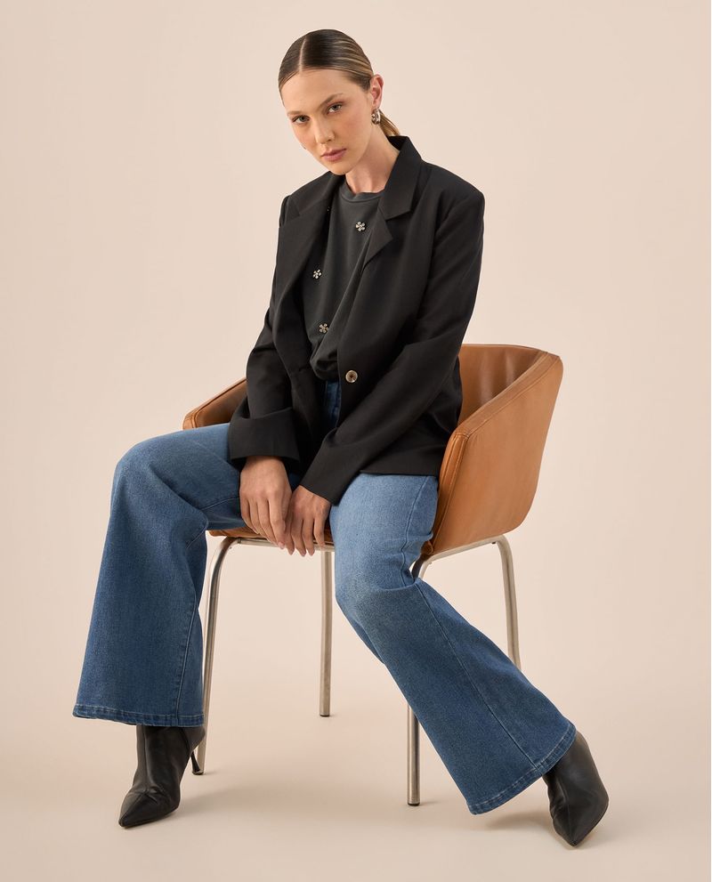 Blazer negro con corte oversized y solapas amplias que aporta estructura sin rigidez. Su mezcla de algodón y tencel ofrece comodidad transpirable, mientras que el forro interior garantiza una caída impecable. Funciona tanto para reuniones ejecutivas como para cenas casuales, adaptándose a tu ritmo profesional con estilo relajado pero sofisticado.