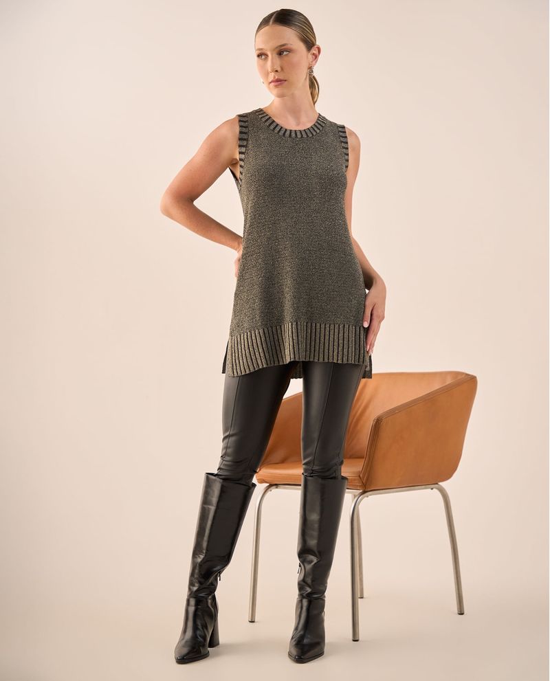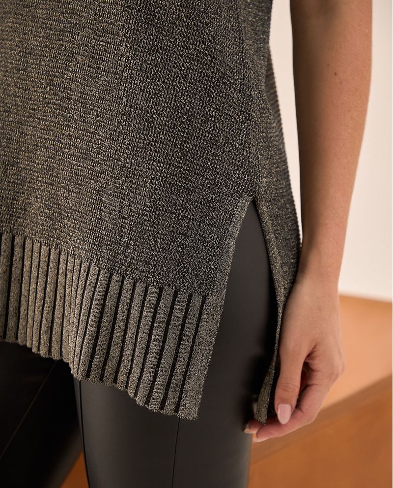 Blusa gris sin mangas con tejido de punto suave y acabados acanalados que aportan estructura. Su corte relajado permite libertad de movimiento, mientras que las aberturas laterales facilitan el layering. Ideal para crear looks versátiles desde la oficina hasta encuentros casuales, funciona como base o pieza principal según la ocasión.