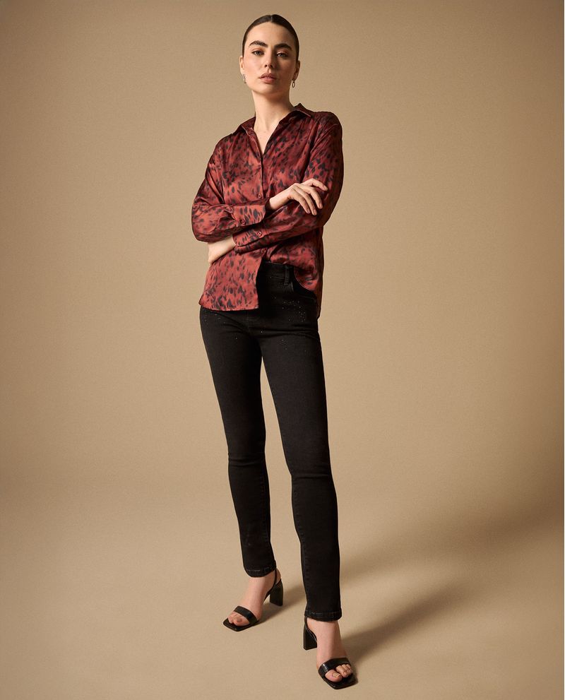 Camisa naranja terracota con estampado animal print orgánico que aporta personalidad sin esfuerzo. Su tejido fluido de poliéster premium garantiza comodidad durante todo el día, mientras que el corte regular se adapta a diferentes siluetas con elegancia natural. Los botones tono sobre tono y el cuello camisero estructurado completan un diseño que transiciona fácilmente de reuniones matutinas a cenas nocturnas.