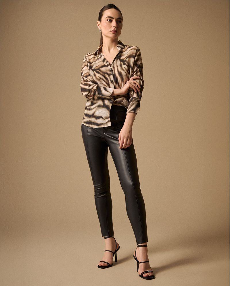 Camisa en tonos beige y marrón con estampado animal print sutil y cuello camisero estructurado. Su mezcla de viscosa y poliamida ofrece caída fluida y comodidad durante todo el día, mientras que los botones frontales permiten múltiples estilos de uso. Ideal para oficina, eventos casuales y salidas sociales donde buscas ese equilibrio entre sofisticación y naturalidad.