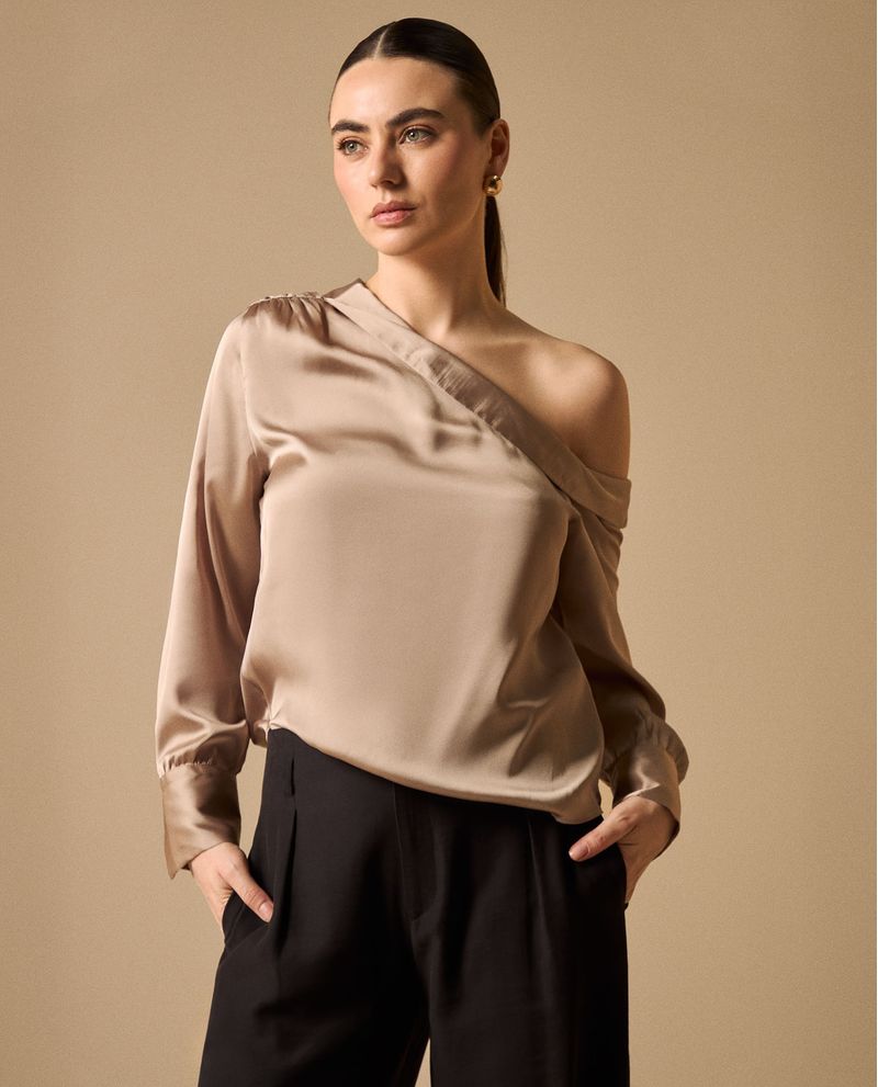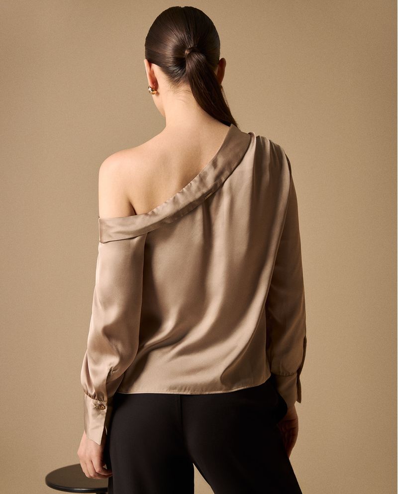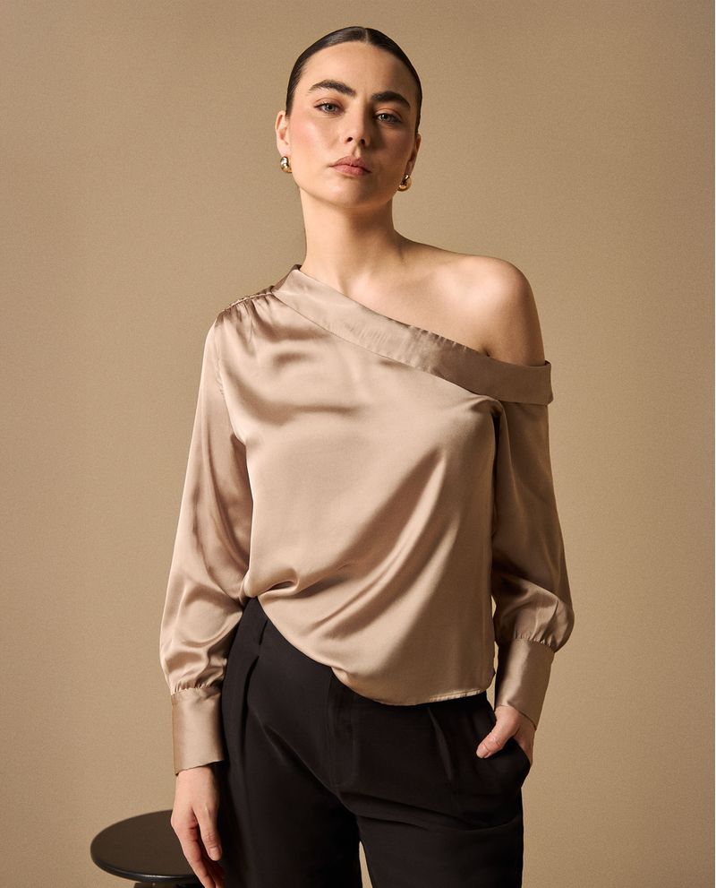 Su tejido fluido acaricia la piel con suavidad mientras que el diseño asimétrico crea una sensación de libertad y movimiento natural. El corte off-shoulder genera una elegancia relajada que te hace sentir sofisticada sin restricciones.