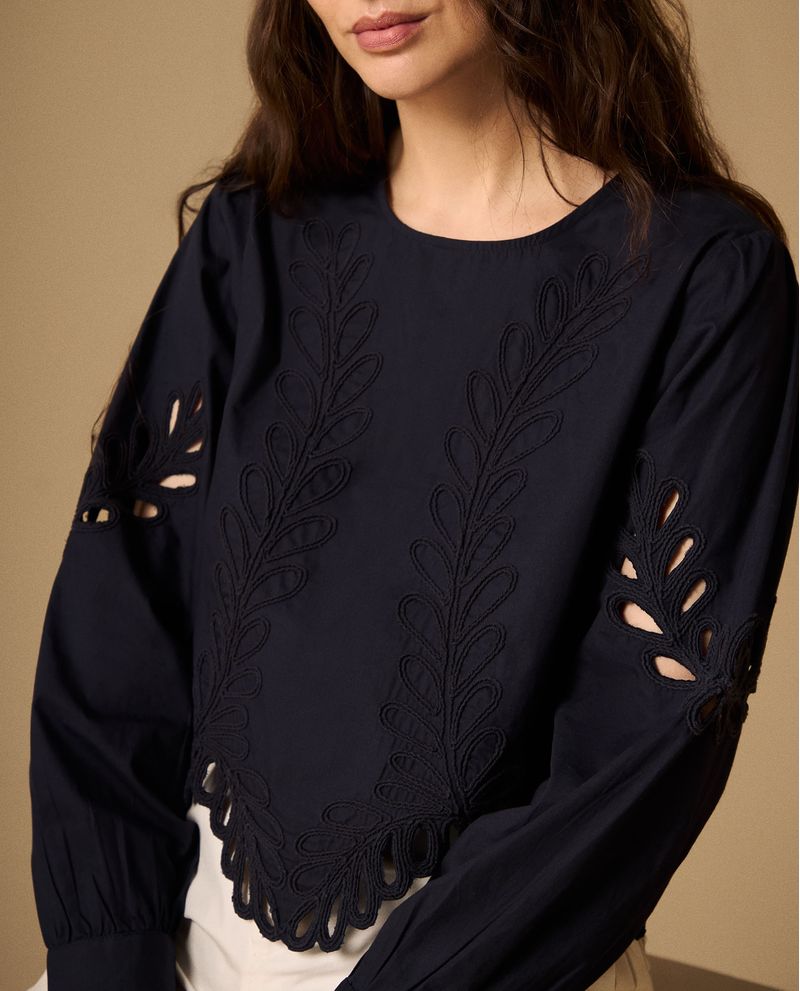 Camisa azul marino con bordados florales en relieve y calados decorativos que crean transparencias sutiles. Su técnica artesanal combina tradición y modernidad, mientras que el cuello redondo y la abertura posterior con botón aportan comodidad. Los puños elásticos y el borde festoneado completan un diseño sofisticado para ocasiones especiales y uso profesional creativo.