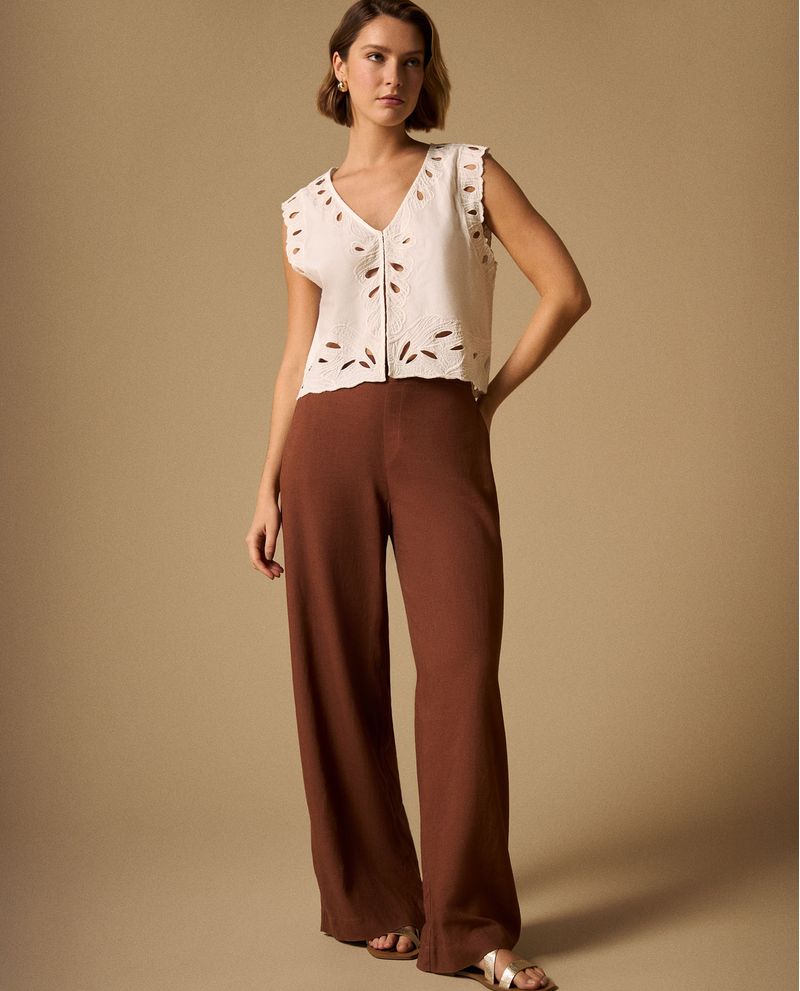 Esta camisa blanca destaca por sus bordados calados artesanales que crean un juego visual sofisticado, mientras que su corte sin mangas la convierte en la opción ideal para climas cálidos. El diseño simétrico de flores caladas aporta feminidad sin sacrificar versatilidad, perfecta para quienes buscan piezas que transiten del trabajo a eventos sociales con naturalidad.