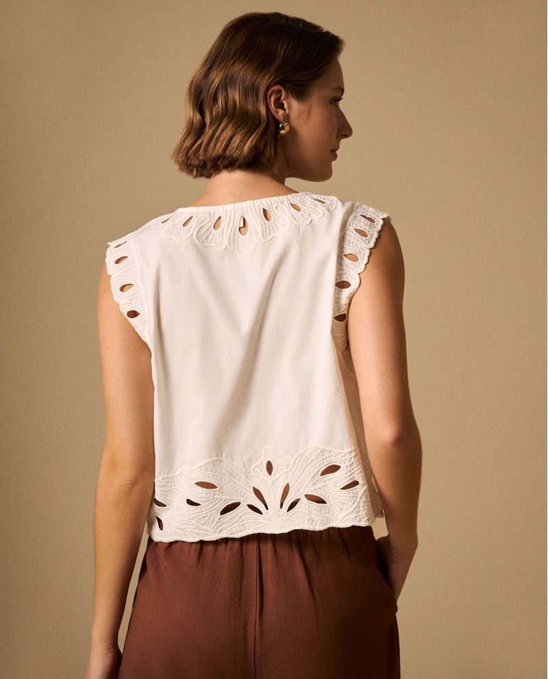 El algodón natural se siente suave contra la piel y permite que el aire circule libremente a través de los bordados calados. Su peso ligero y la ausencia de mangas brindan frescura durante todo el día.