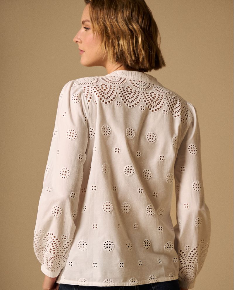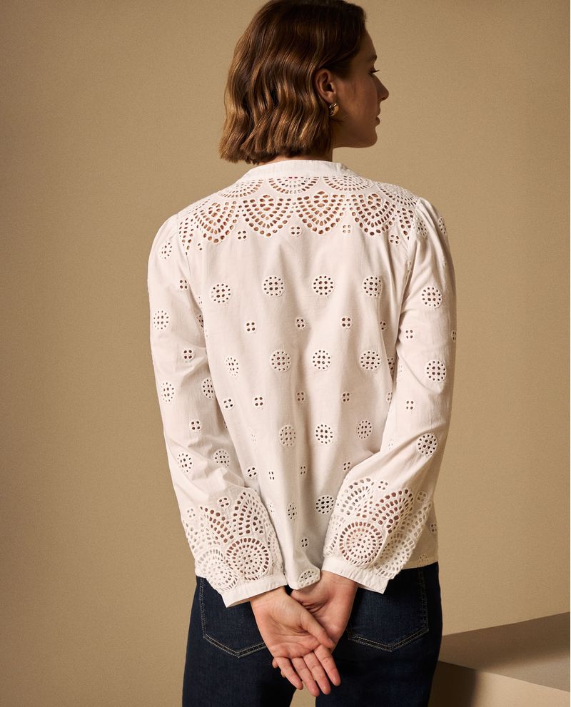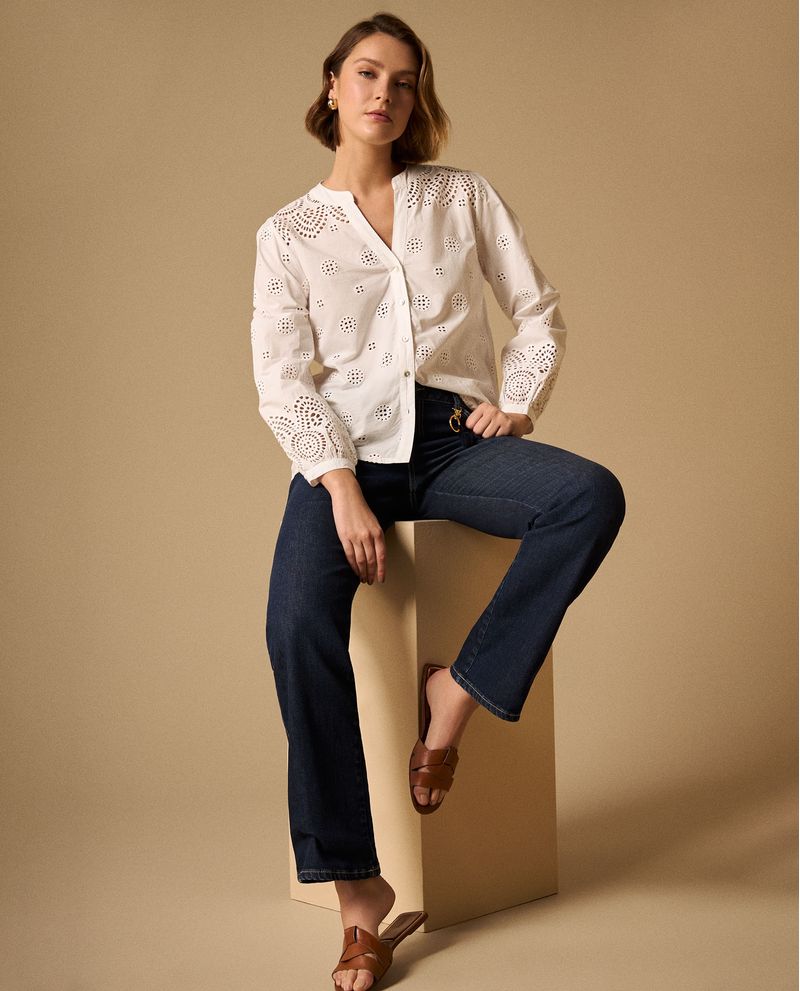 Camisa blanca con bordados calados tipo inglés que aportan textura y sofisticación sin sacrificar versatilidad. Sus detalles artesanales en hombros y puños crean un equilibrio entre elegancia y frescura, mientras que el corte regular se adapta cómodamente a diferentes siluetas. Funciona tanto para reuniones de trabajo como para almuerzos casuales, gracias a su capacidad de transformarse según los complementos elegidos.