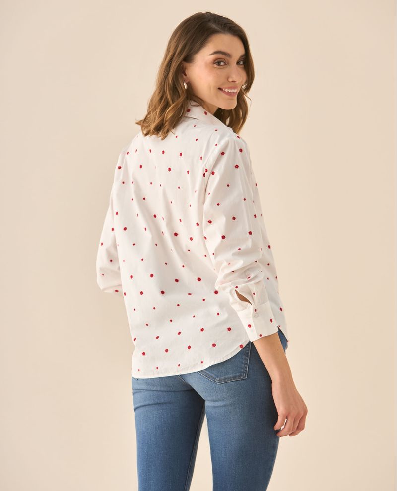 Detalles que enamoran. Esta camisa clásica con cuello camisero y manga larga con mini flores bordadas, perfecta para acompañar cualquier look. Lúcela con jeans o pantalones suaves, donde la dulzura habla por sí sola.