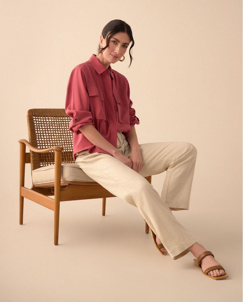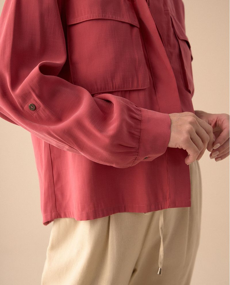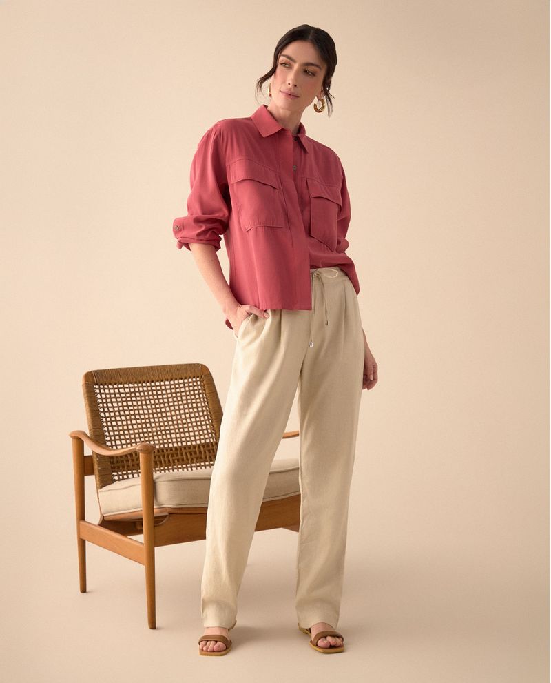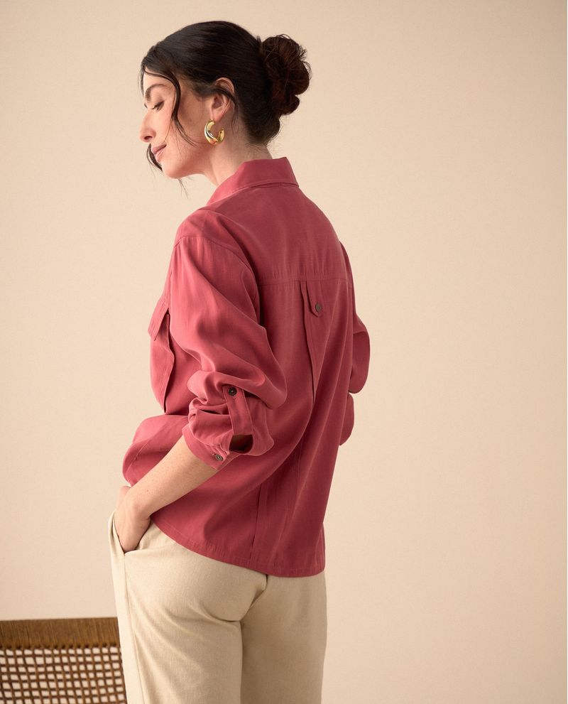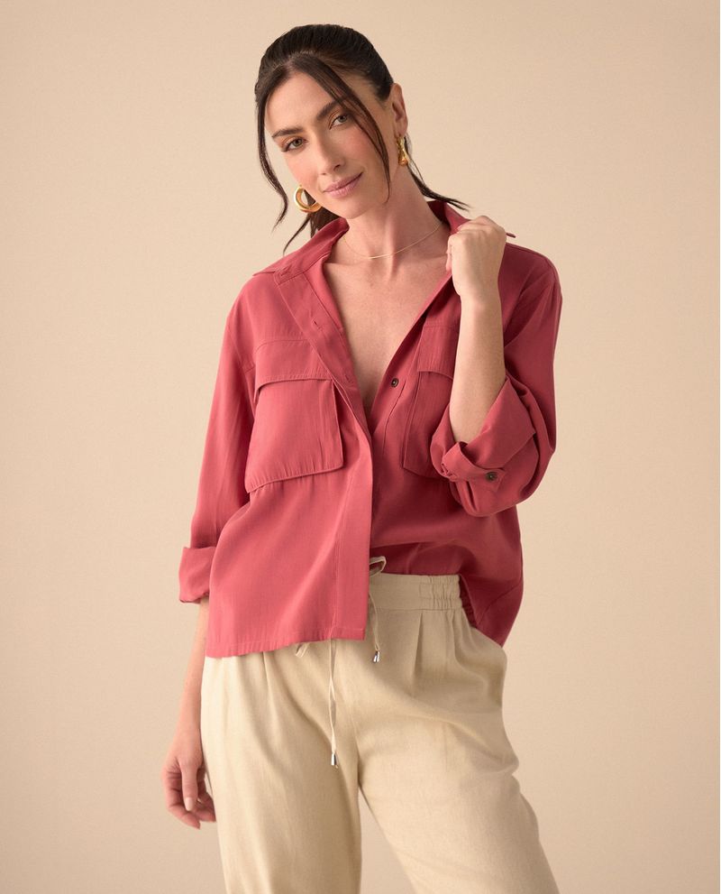 Elegancia con un toque relajado. Camisa de manga larga con cuello clásico, perilla con botones oculta y puños con recogido, acompañada de bolsillos de tapa y una textura suave que hará que tu día se sienta más cómodo.