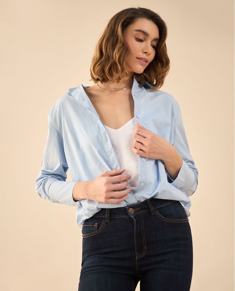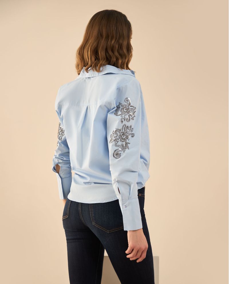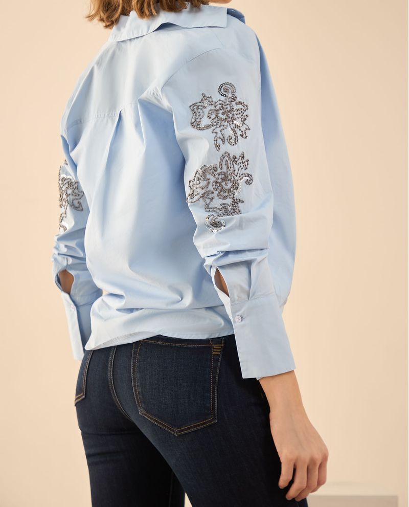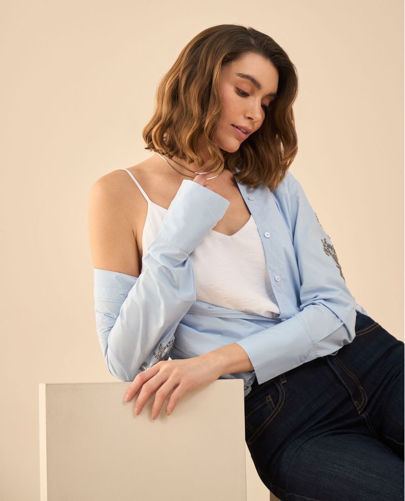 Una camisa que reinterpreta lo clásico con un toque sutil de brillo. Los bordados florales resaltan con apliques de piedras, añadiendo un detalle sofisticado, mientras su perilla oculta y ruedo curvo aportan un acabado impecable y elegante.