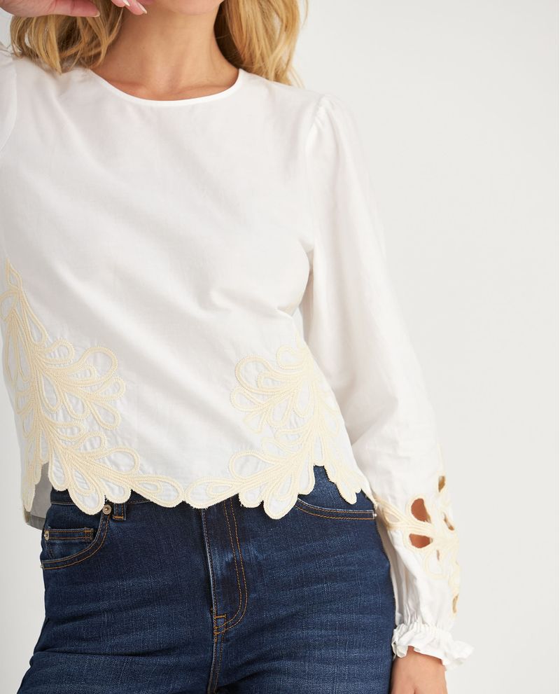 Esta camisa es todo lo que necesitas para un look femenino y fresco. Con bordados delicados en las mangas y el ruedo, y puños elásticos con un mini bolero que le dan ese toque romántico, se convertirá en tu favorita. El cierre con botón en la parte posterior asegura un ajuste cómodo, mientras su diseño cerrado te hará lucir elegante sin esfuerzo.