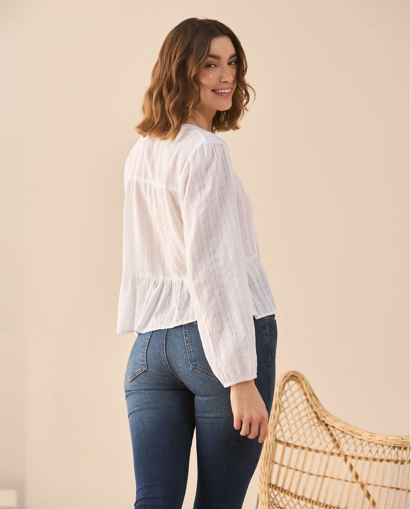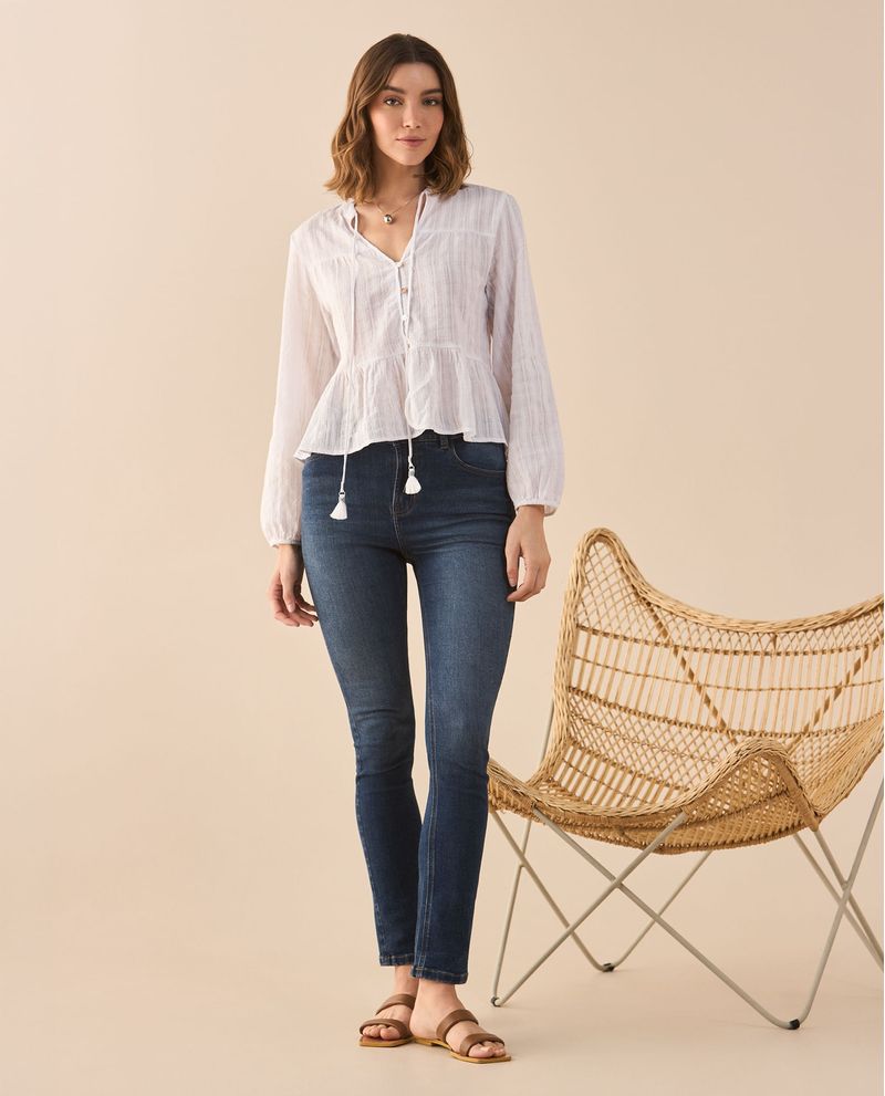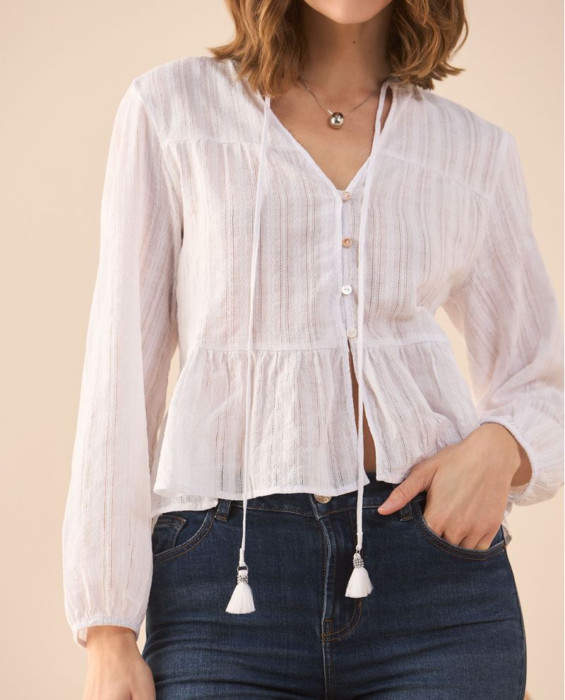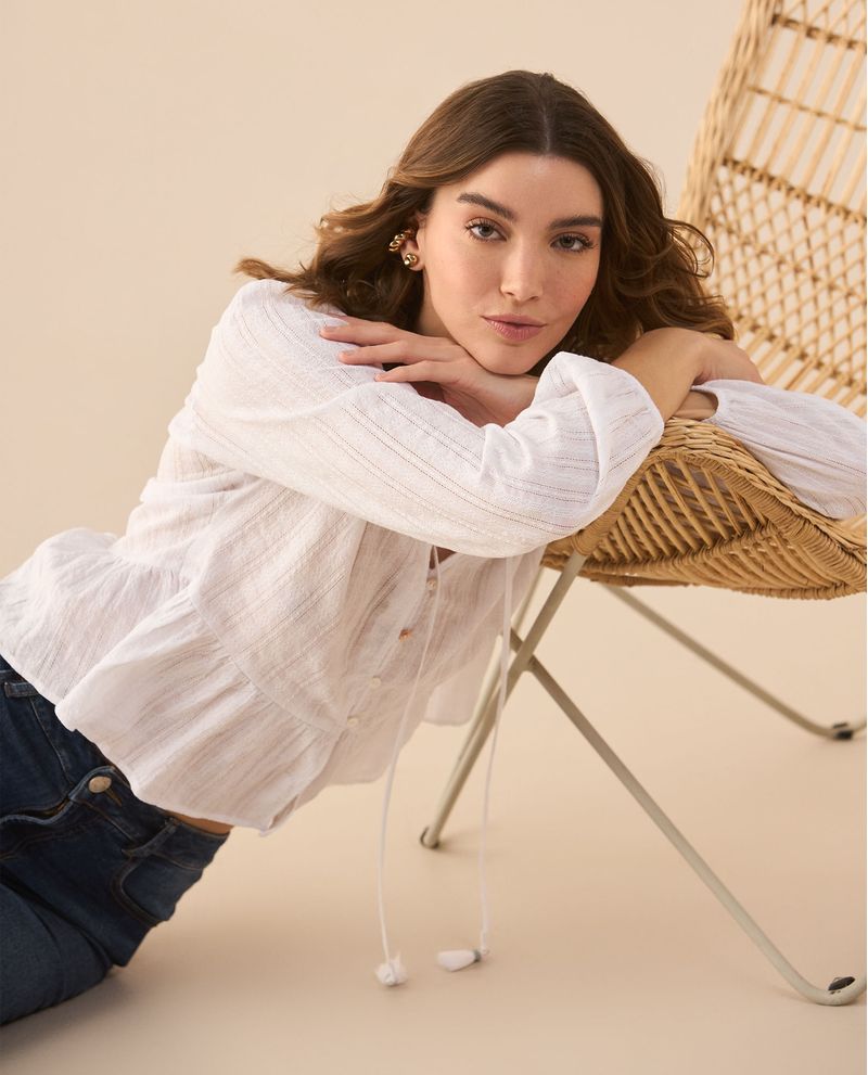 Un toque boho para elevar tu look con la fluidez de su tela y los detalles desagujados que la hacen única; además, su bolero en la cintura le brinda un aire romántico y lleno de estilo que la convierte en la camisa perfecta para combinar con jeans o faldas.