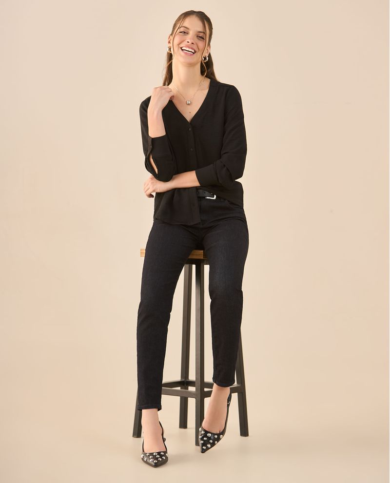 ¡Fresca, ligera y con ese toque effortless que enamora! Esta camisa fluida, con escote en V y manga larga, es de esas prendas que siempre son bien recibidas en un armario femenino. ¡Úsala suelta, ajustada o abierta sobre una básica! Siempre queda bien.