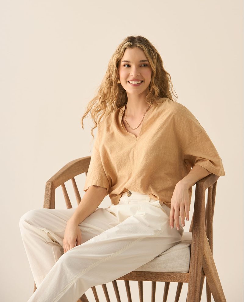 ¡Un clásico renovado! Esta camisa con escote en V y cuello neru mezcla elegancia y frescura. Su manga corta y largo pretinero la hacen ideal para esos días en los que quieres sentirte cómoda pero impecable. ¡Perfecta para un look casual-chic sin esfuerzo!