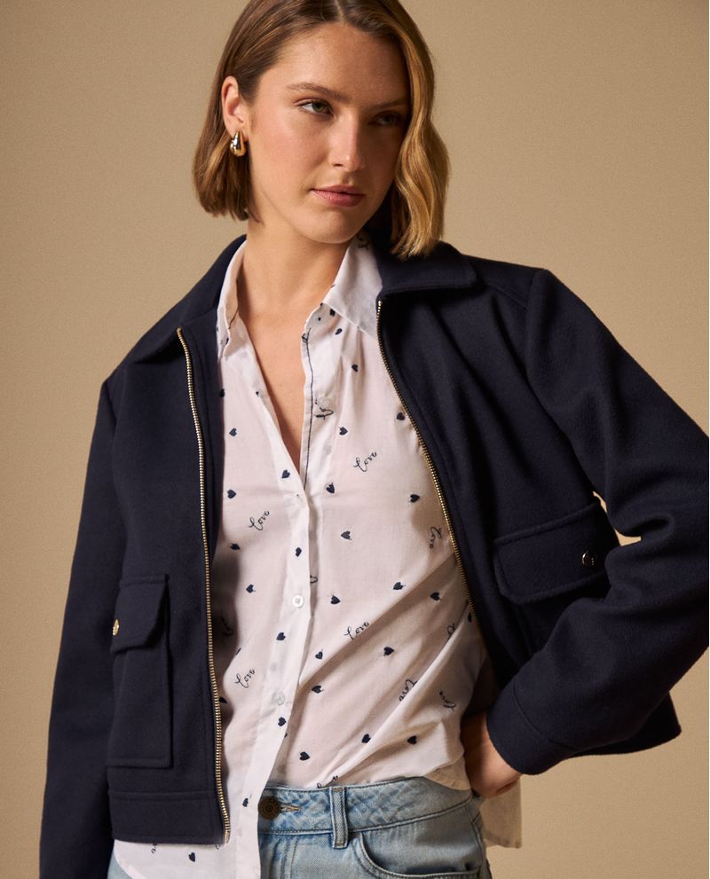 Camisa con encantador estampado de corazones y texto love en azul marino que aporta un toque romántico sin perder sofisticación. Su corte regular y cuello camisero estructurado la convierten en la opción ideal para quienes buscan feminidad moderna, desde reuniones de trabajo hasta cenas especiales. El tejido de calidad mantiene su forma y color con el uso regular.