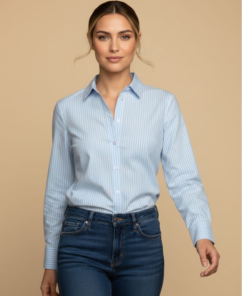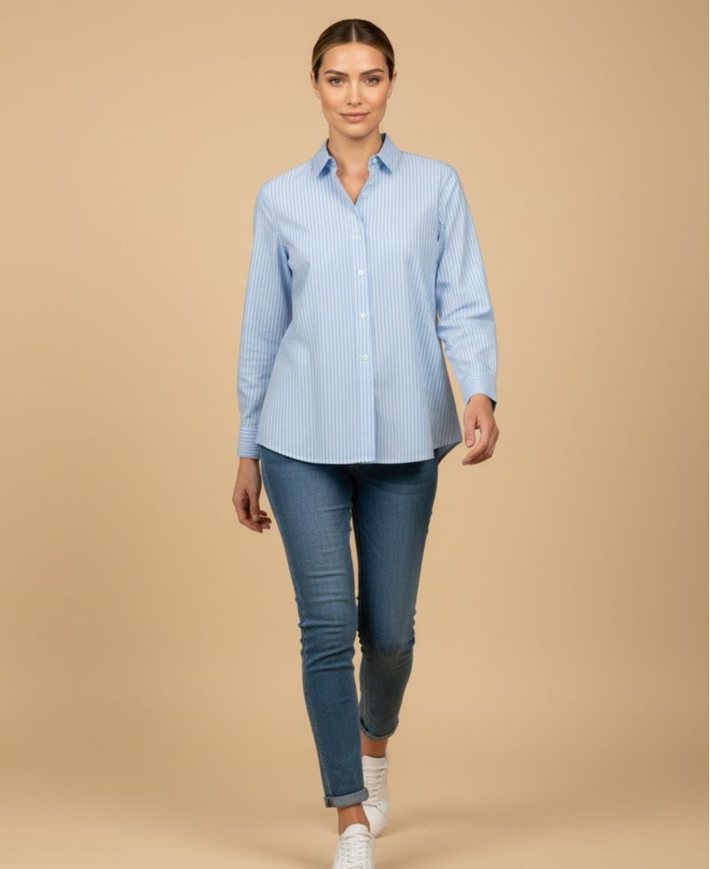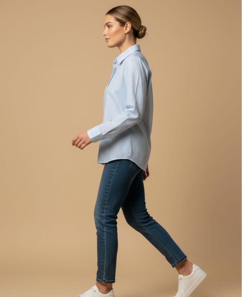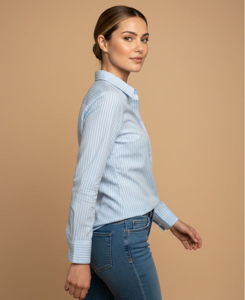 Camisa azul con rayas finas que aporta sofisticación sutil y dinamismo visual. Su patrón lineal crea profundidad mientras que el corte clásico se adapta cómodamente a diferentes siluetas, funcionando tanto para reuniones profesionales como para encuentros casuales gracias a su capacidad de transición entre contextos formales e informales.