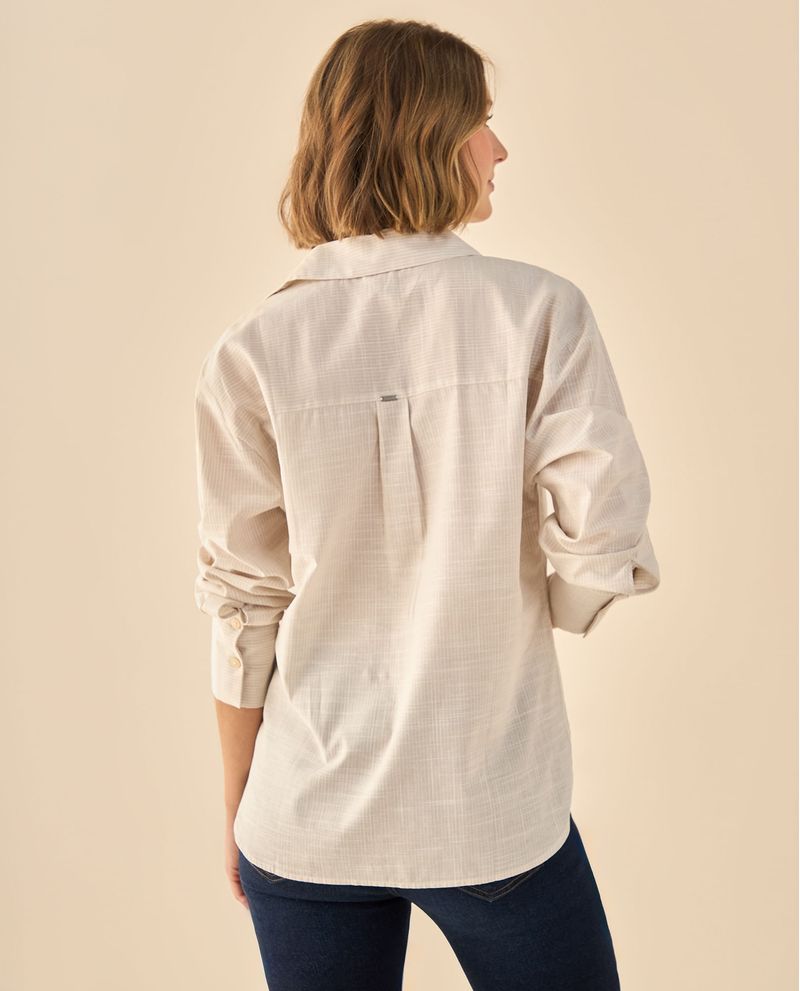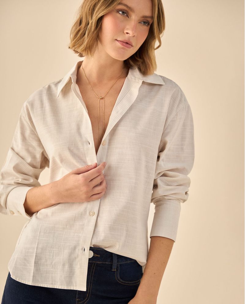 Camisa con micro textura cuadriculada que aporta sofisticación sutil, mientras que su corte oversized garantiza comodidad durante jornadas completas. Su construcción premium mantiene la forma lavado tras lavado, perfecta para oficina y eventos casuales donde necesitas lucir pulida sin rigidez.