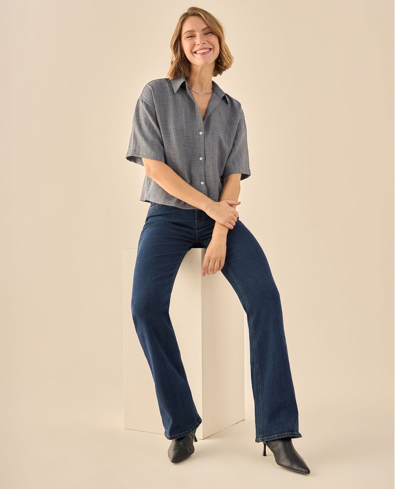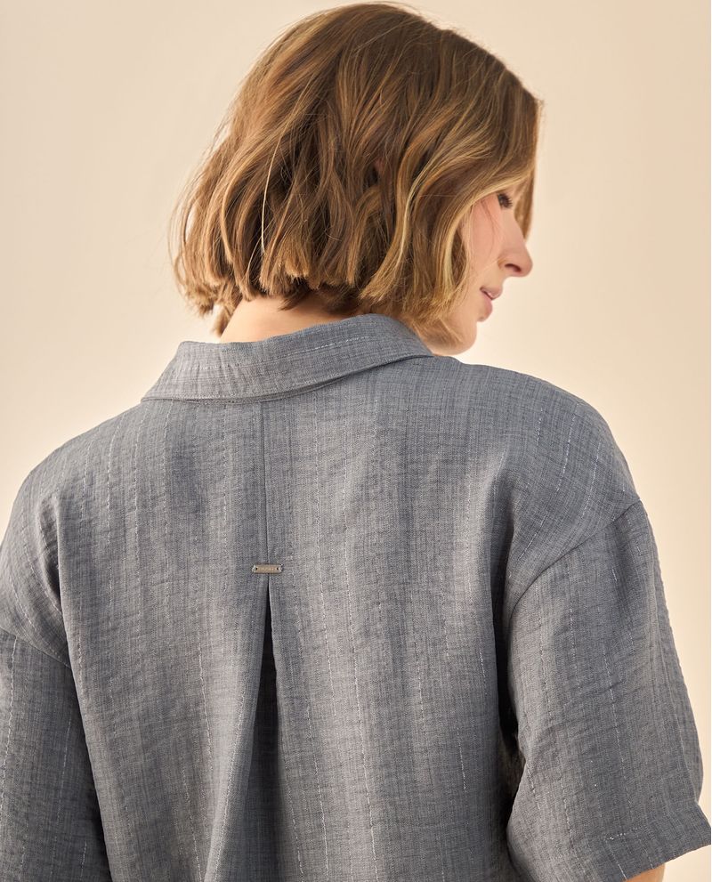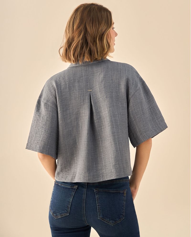 Camisa con textura jaspeada natural que presenta un corte cropped moderno y cuello estructurado. Su construcción incluye botones decorativos y pliegue posterior que aporta movimiento, ideal para quienes buscan equilibrio entre comodidad y elegancia en sus looks diarios.