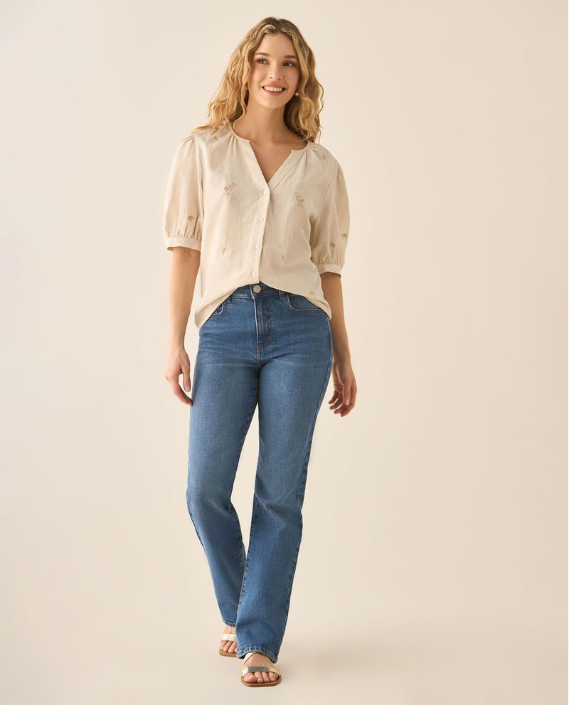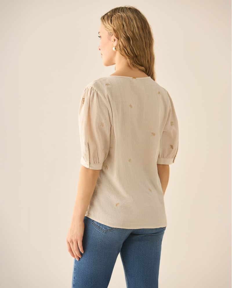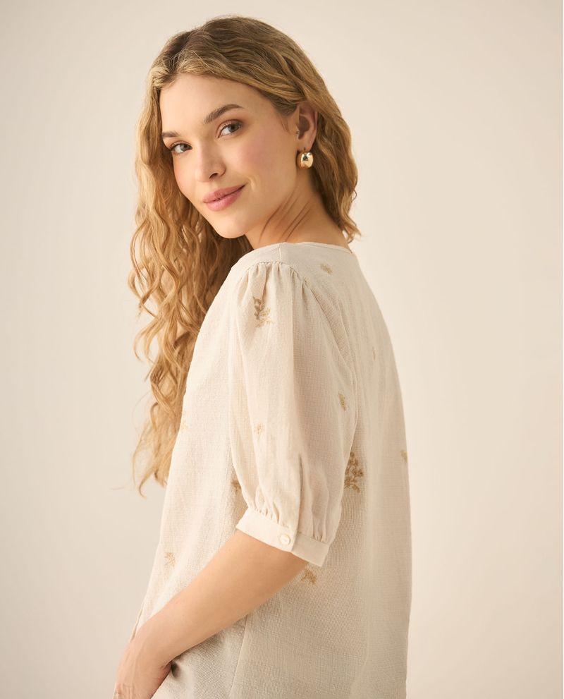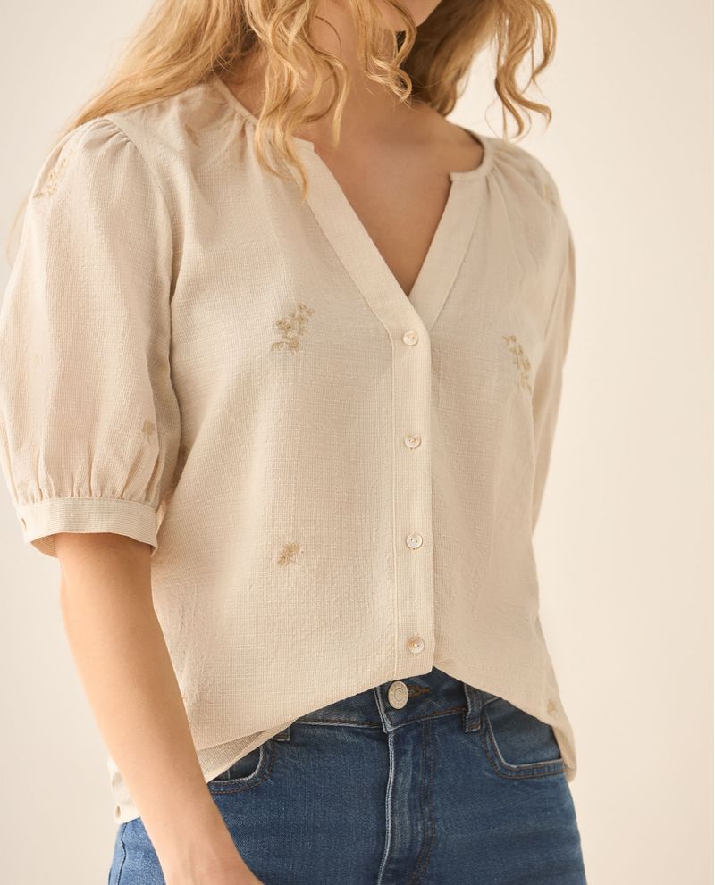 Romanticismo bordado. Esta camisa, con cuello nerú, escote en V y mangas con volumen, se adorna con detalles bordados sobre una tela de textura delicada. Una prenda para brillar sin esfuerzo.