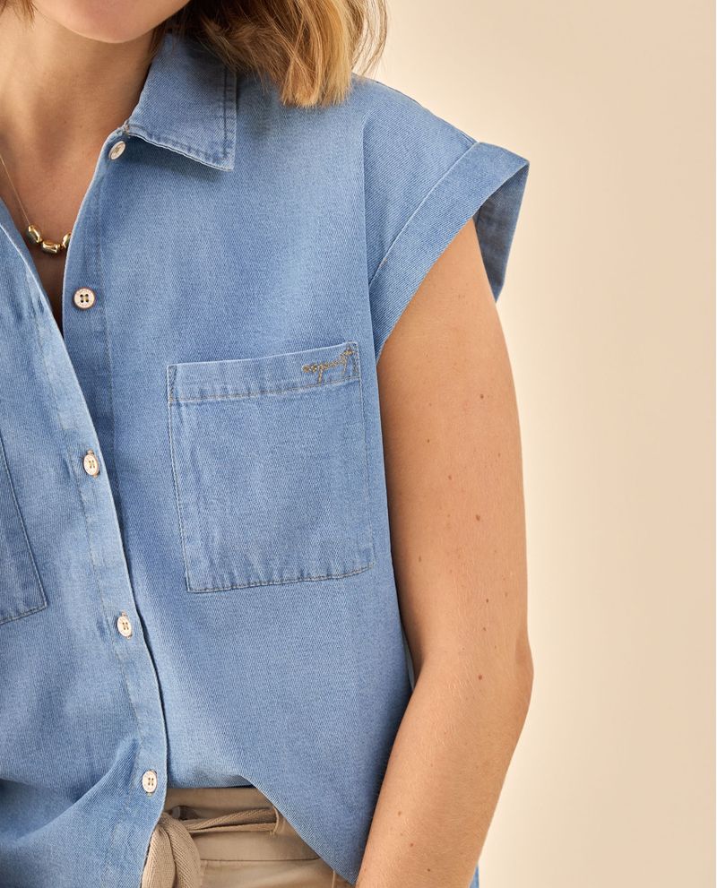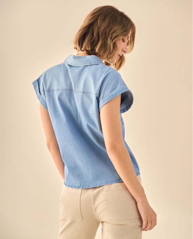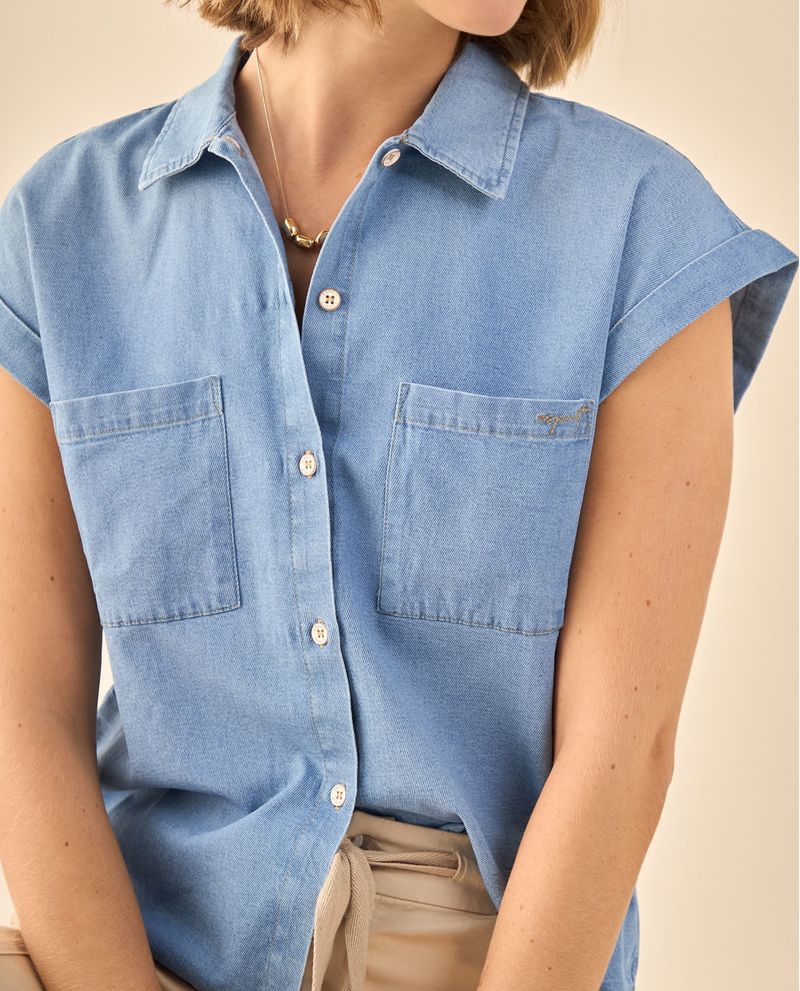 Camisa en tejido chambray suave con mangas cortas de dobladillo enrollado y botones contrastantes que aportan frescura moderna. Su corte relajado se adapta cómodamente mientras que los dos bolsillos frontales añaden funcionalidad práctica, ideal para oficina casual y encuentros informales donde la elegancia relajada marca la diferencia.