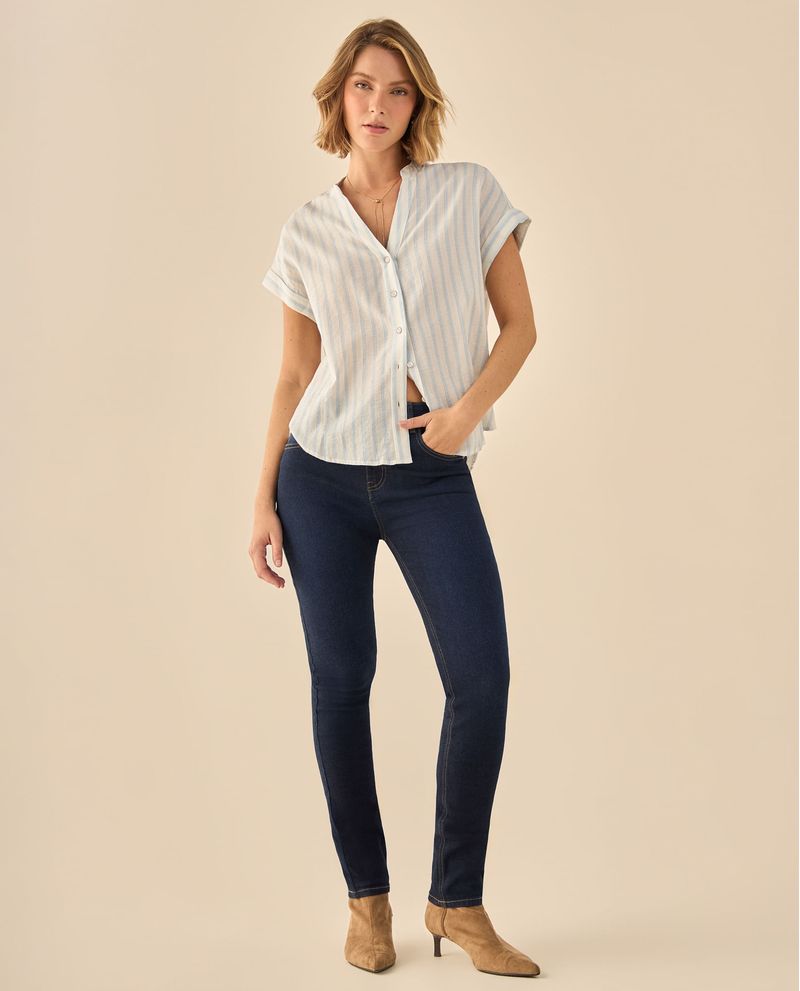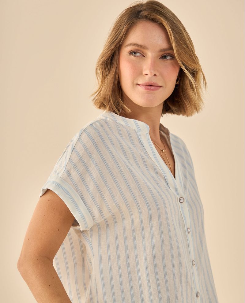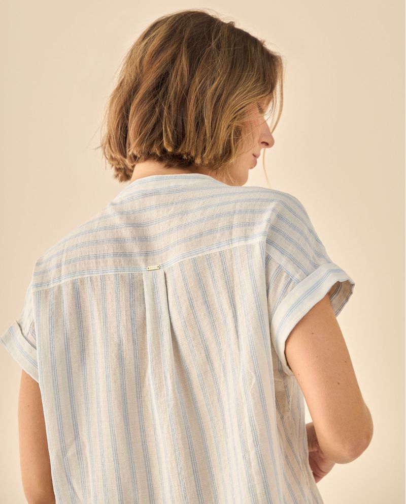 Camisa con rayas en corte oversized que aporta frescura y movimiento natural. Su construcción con botones nacarados y pliegue posterior crea una silueta relajada pero cuidada, mientras que el patrón de rayas verticales estiliza la figura. Diseñada para transitar desde reuniones matutinas hasta cenas casuales con la misma elegancia natural.