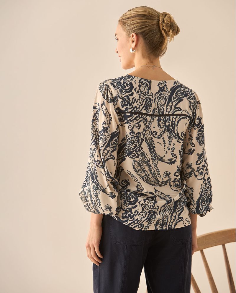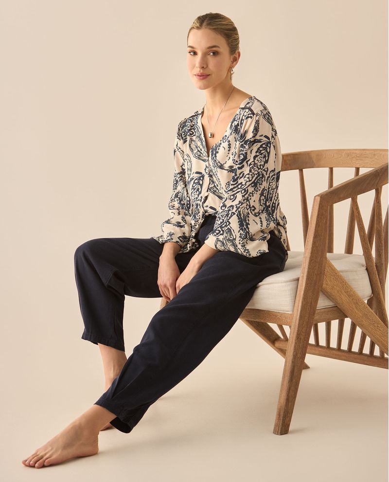 Sutileza que conquista cada día. Esta camisa de manga larga y escote en V destaca por su tela fluida y estampado suave, mientras que los botones forrados y los cortes tejidos en hombros y espalda añaden personalidad. Perfecto para combinar con jeans o pantalones por igual.