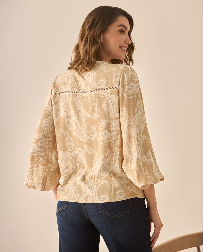 Sutileza que conquista cada día. Esta camisa de manga larga y escote en V destaca por su tela fluida y estampado suave, mientras que los botones forrados y los cortes tejidos en hombros y espalda añaden personalidad. Perfecto para combinar con jeans o pantalones por igual.