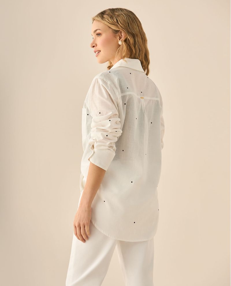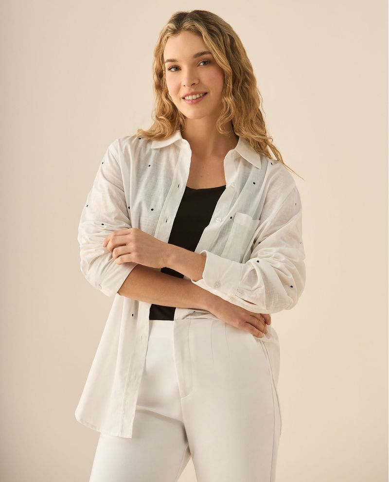 Diseño bordado y sofisticado. Esta camisa de manga larga, con lunares en miniatura bordados y un corte clásico impecable, aporta un toque juguetón a cualquier look formal o casual. Detalles como el bolsillo de parche y los puños con botón la hacen tan funcional como femenina.