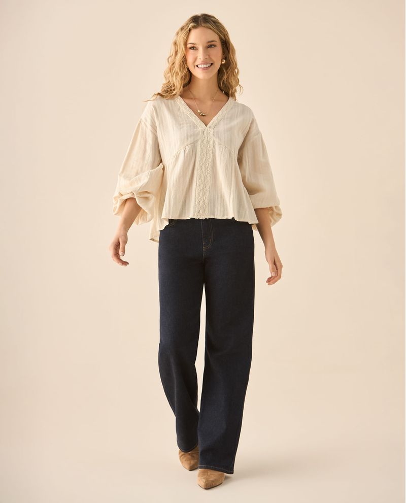 Romanticismo artesanal. Esta camisa de manga larga con volumen, puños elásticos, escote en V y detalles en crochet, evoca delicadeza y sofisticación. Perfecta para tardes cálidas en compañía de pantalones holgados.