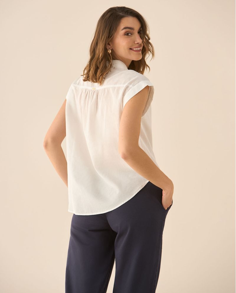 Delicada y versátil. Esta camisa de manga sisa con guardapolvo, cuello clásico y recogido en los hombros se eleva con un sutil bordado tono a tono en la perilla. Ideal para climas cálidos o para llevar con un blazer, sumando feminidad a cualquier look.