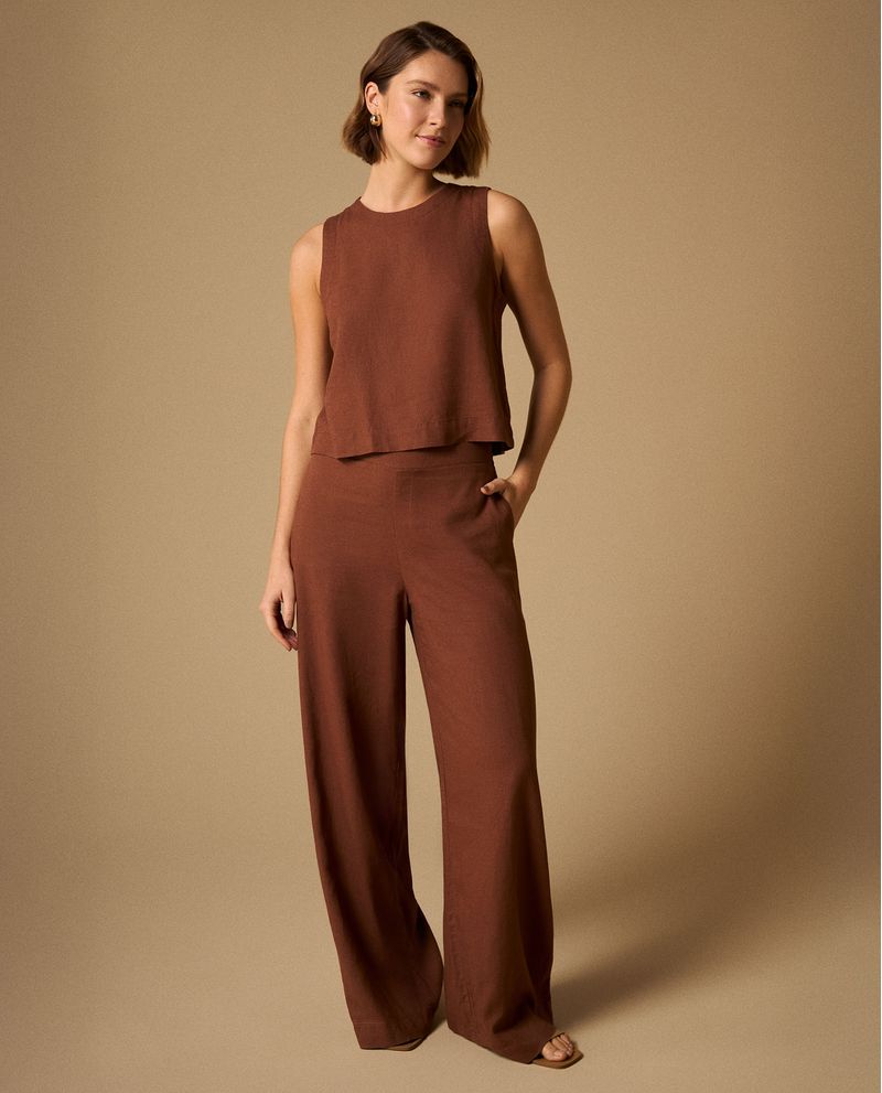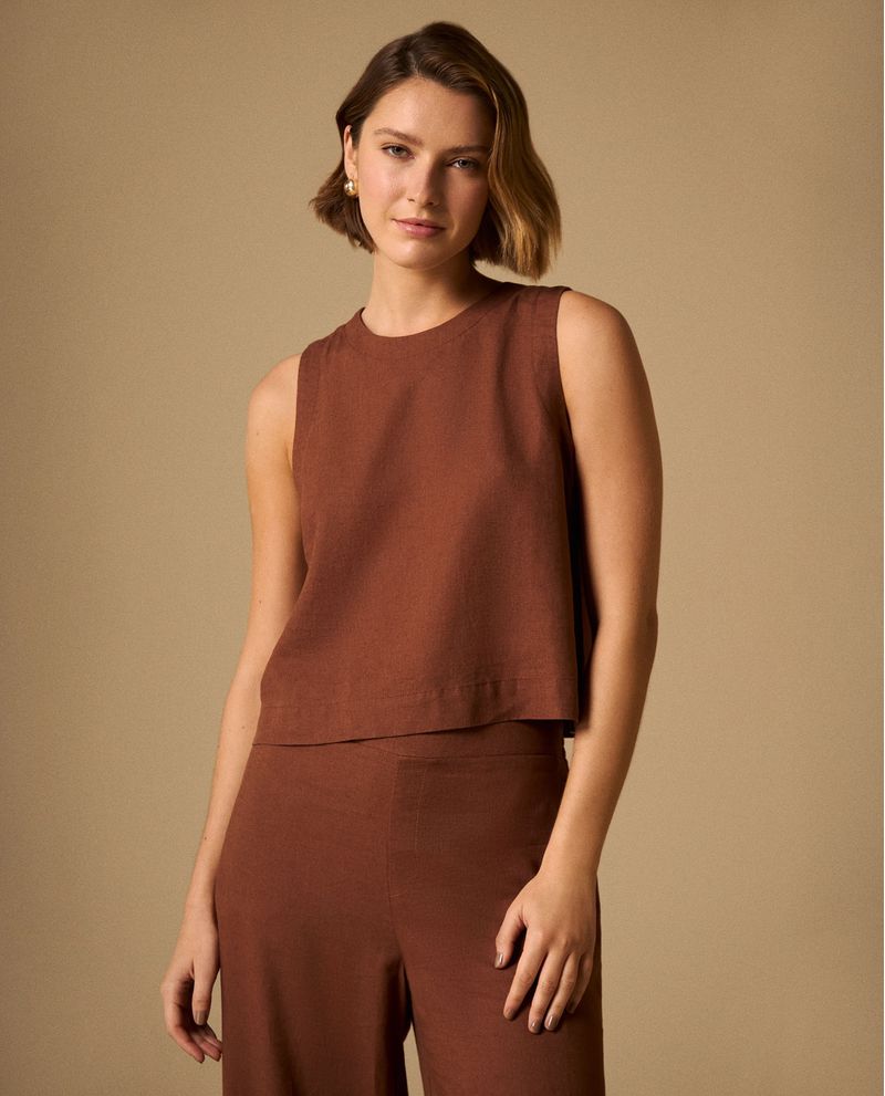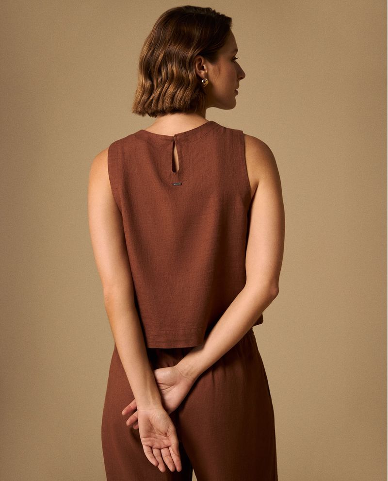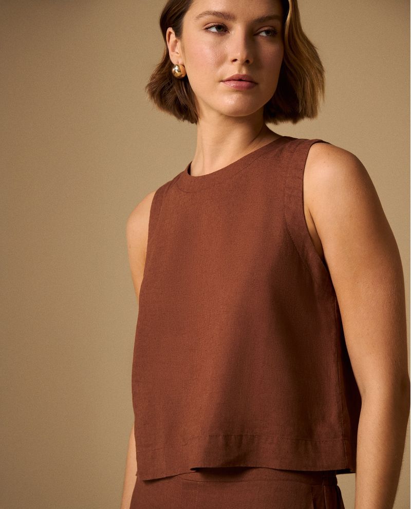 Camisa café visón sin mangas con mezcla de lino y rayón que aporta frescura natural, mientras que la abertura posterior con botón añade un detalle sofisticado. Su corte relajado se adapta cómodamente al cuerpo sin ceñirse, ideal para días cálidos en la oficina o reuniones casuales donde necesitas lucir pulida sin sacrificar comodidad.