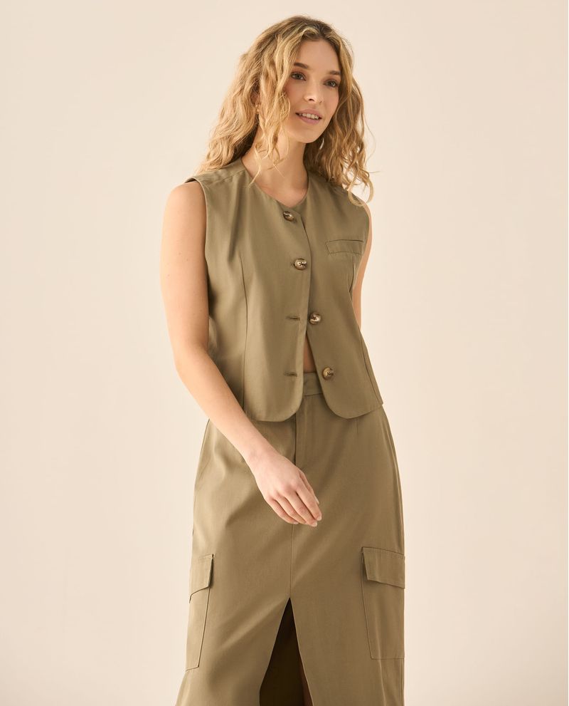 Diseño que abraza lo clásico con un guiño contemporáneo. Esta camisa tipo chaleco, de manga sisa y cuello redondo, destaca por sus cortes en el delantero y un bolsillo de ribete decorativo en el punto corazón. Su ajuste con botones la convierte en una opción perfecta para combinaciones sofisticadas en el día a día.