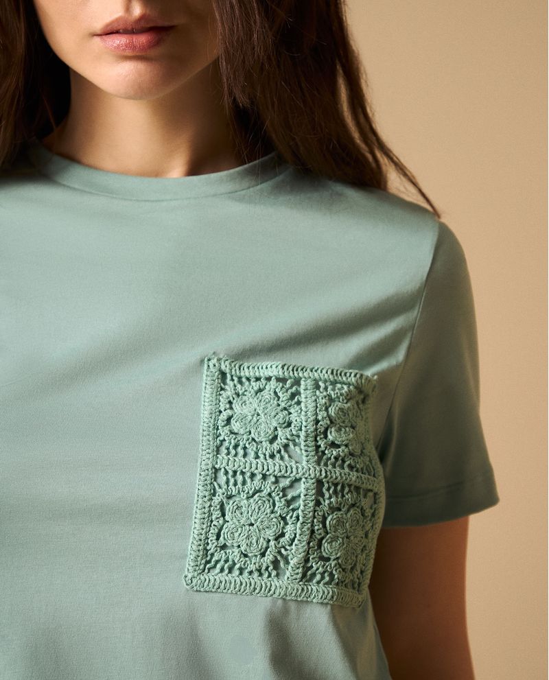 Camiseta blanca con bolsillo bordado en encaje que aporta textura y sofisticación a tus básicos. Su corte regular se adapta cómodamente mientras que el detalle artesanal la convierte en una pieza distintiva para uso diario y ocasiones especiales.