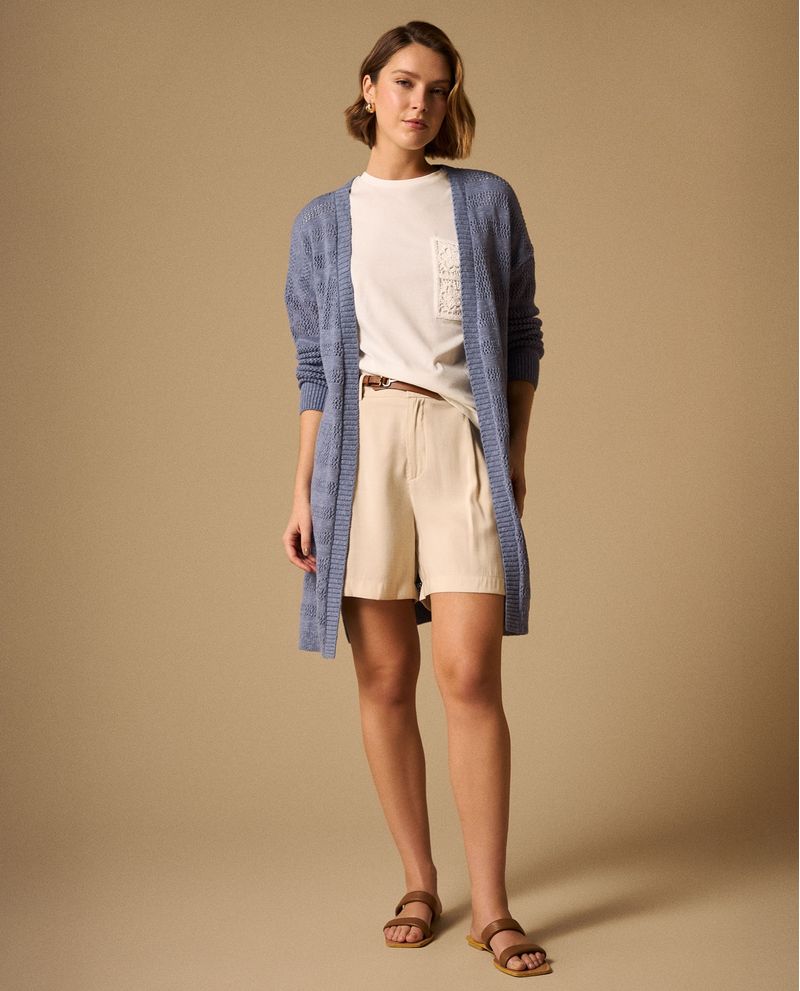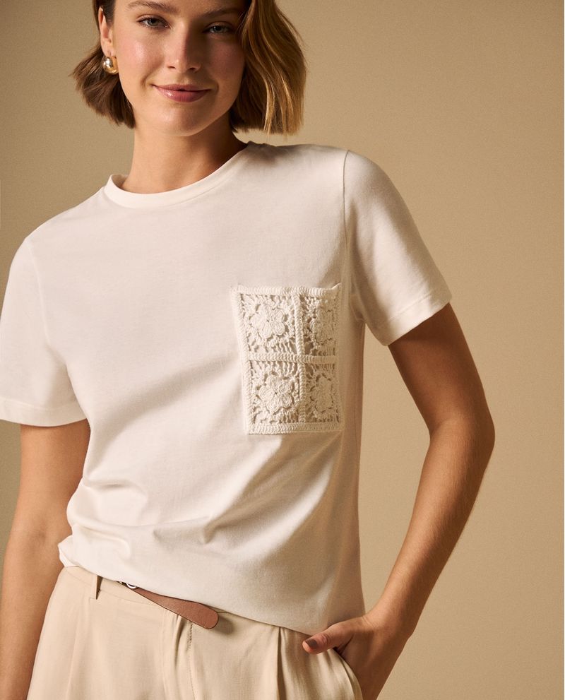 Camiseta Blanca con Bordado en Encaje Camiseta blanca con bolsillo bordado en encaje que aporta textura y sofisticación a tus básicos. Su corte regular se adapta cómodamente mientras que el detalle artesanal la convierte en una pieza distintiva para uso diario y ocasiones especiales. ¿Cómo se siente? Suave al tacto gracias al algodón natural, con una caída fluida que se mueve contigo. El bordado añade una textura delicada que se aprecia tanto visual como táctilmente. ¿Cómo es el fit y para quién es ideal? Corte regular que sienta bien en todo tipo de siluetas, con largo que permite usar tanto por dentro como por fuera. La manga corta cae naturalmente sin ajustar en exceso. ¿Cómo usarlo? Para el día a día, combínala con jeans y zapatillas blancas, añadiendo un blazer cuando necesites un look más pulido. En ocasiones casuales elegantes, úsala con pantalones de vestir y un cardigan ligero. Para fines de semana relajados, combínala con shorts de lino y sandalias, completando con una chaqueta denim para las tardes frescas. ¿Por qué lo necesitas? Porque el bordado artesanal en encaje genera ese detalle diferenciador que buscan quienes valoran la calidad. Un básico que se distingue por su trabajo manual único. ¡Descubre esa textura artesanal hoy mismo!