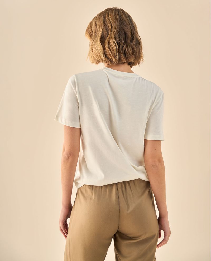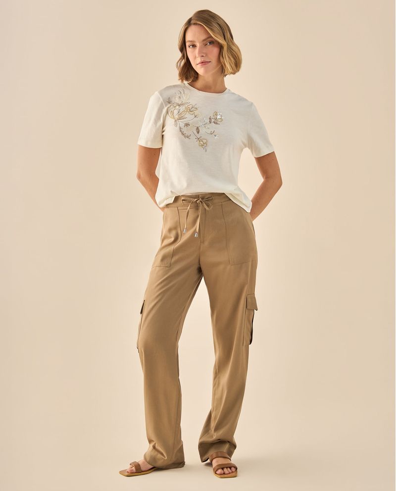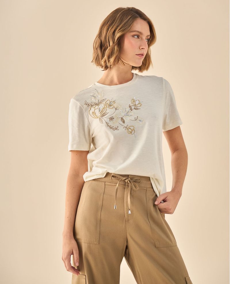 Camiseta con bordados florales que transforman un básico en una pieza distintiva. Su tejido suave se combina con detalles artesanales que añaden sofisticación sin esfuerzo, mientras que el corte regular se adapta cómodamente a diferentes siluetas. Los bordados metálicos crean puntos de luz sutil que elevan cualquier combinación, desde looks de oficina hasta salidas nocturnas.