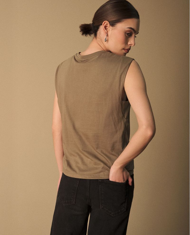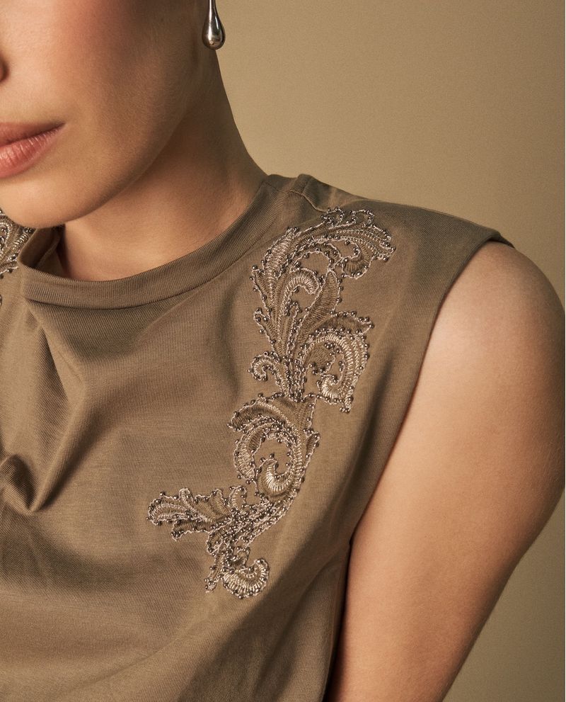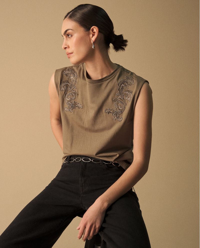 Camiseta olivino sin mangas con bordados paisley blancos que aportan sofisticación artesanal. Su tejido de algodón 100% garantiza frescura y transpirabilidad, mientras que los detalles bordados crean un punto focal distintivo. Corte regular que se adapta cómodamente y funciona tanto para reuniones informales como para salidas de fin de semana.