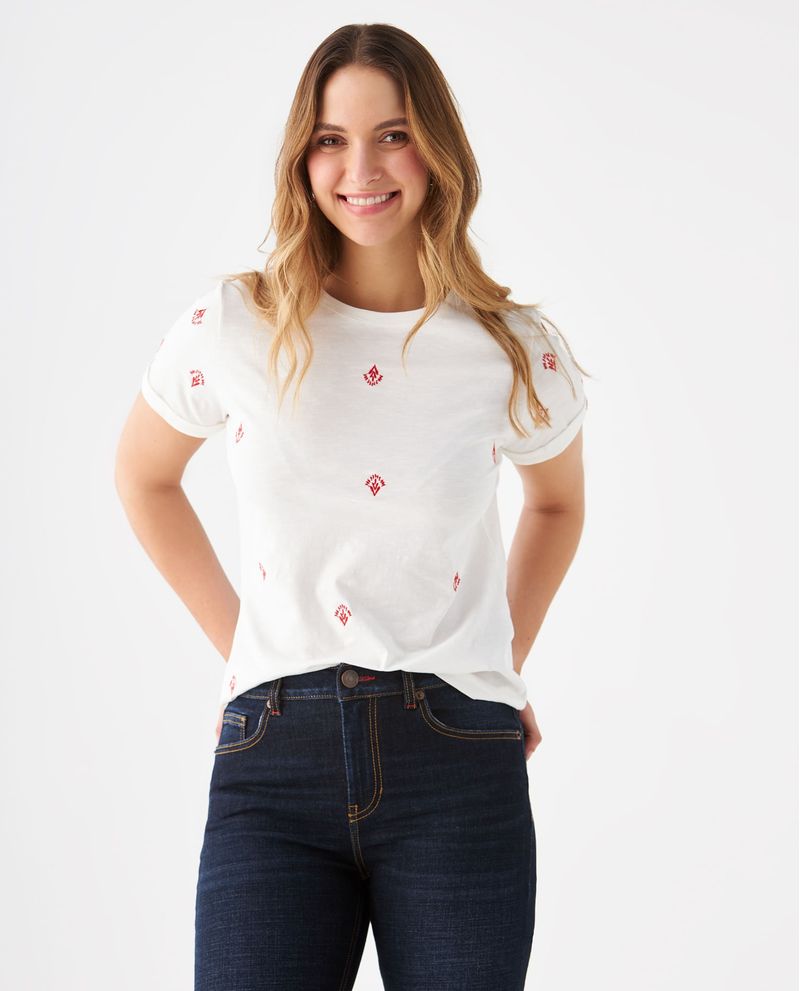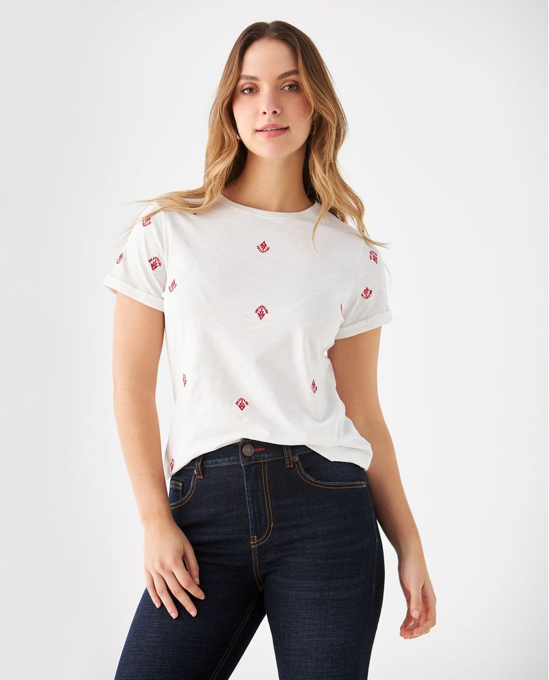 Esta camiseta de silueta tradicional se enriquece con detalles bordados en el frente y las mangas, añadiendo un toque de elegancia a lo cotidiano. ¡Una prenda versátil, ideal para llevar un poco de magia a tus outfits diarios!