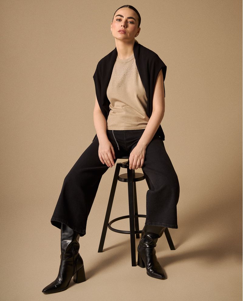 Suave al tacto gracias a la viscosa, con una caída fluida que se adapta naturalmente al cuerpo. Las aplicaciones brillantes añaden textura sin rigidez, creando un contraste agradable entre la base sedosa y los detalles metálicos.