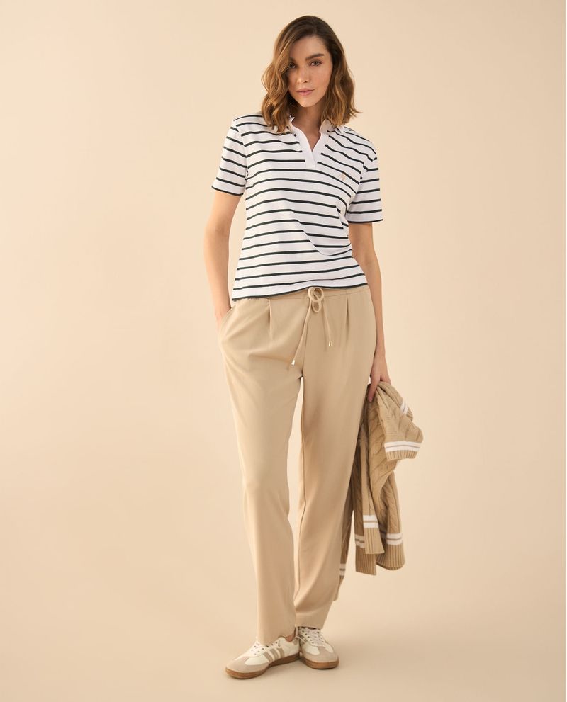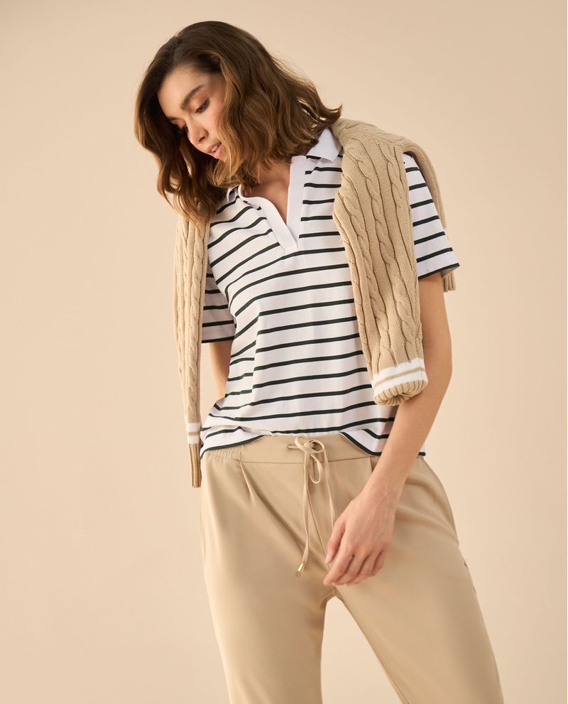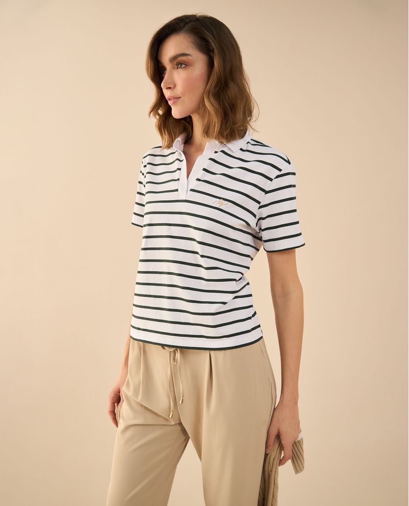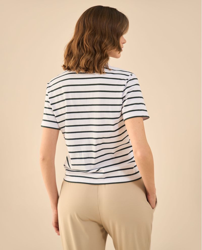 ¡Equilibrio perfecto entre sencillez y estilo! Esta camiseta de rayas combina un escote en V y cuello clásico para un look atemporal, mientras las letras bordadas en punto corazón añaden un detalle sutil con esencia ESPRIT. Ideal para elevar lo cotidiano con un toque distintivo.