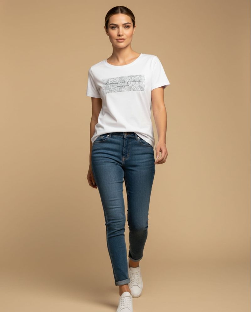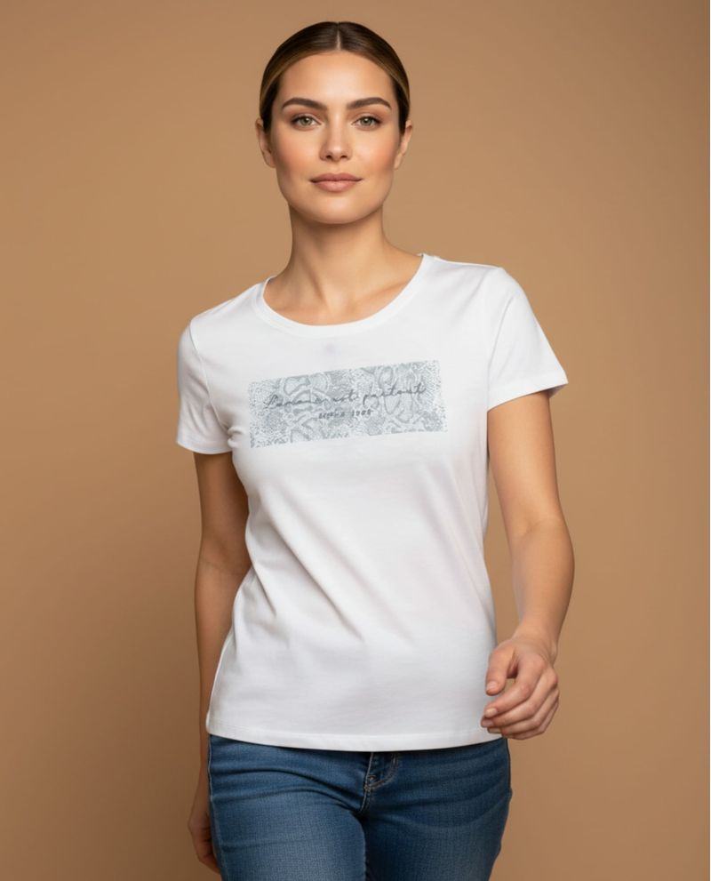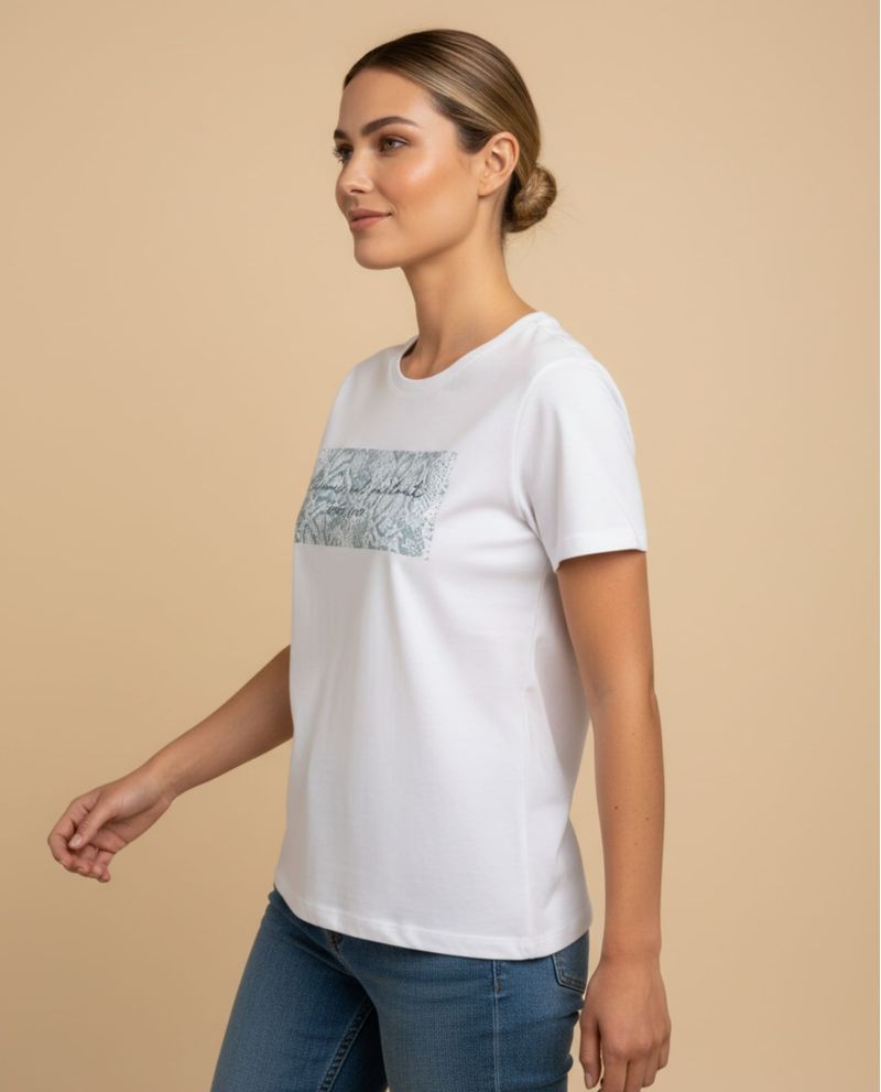 Camiseta blanca con estampado gráfico que combina elementos florales estilizados en tonos suaves, creando un diseño distintivo que aporta personalidad sin resultar llamativo. Su corte regular se adapta cómodamente a diferentes siluetas, mientras que el cuello redondo clásico mantiene la versatilidad para múltiples ocasiones. El estampado artístico la convierte en una opción destacada para quienes buscan diferenciarse del básico tradicional, funcionando tanto para encuentros casuales como para actividades creativas donde se valora el detalle visual.