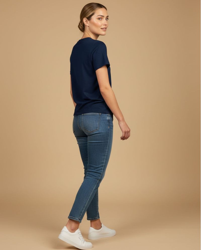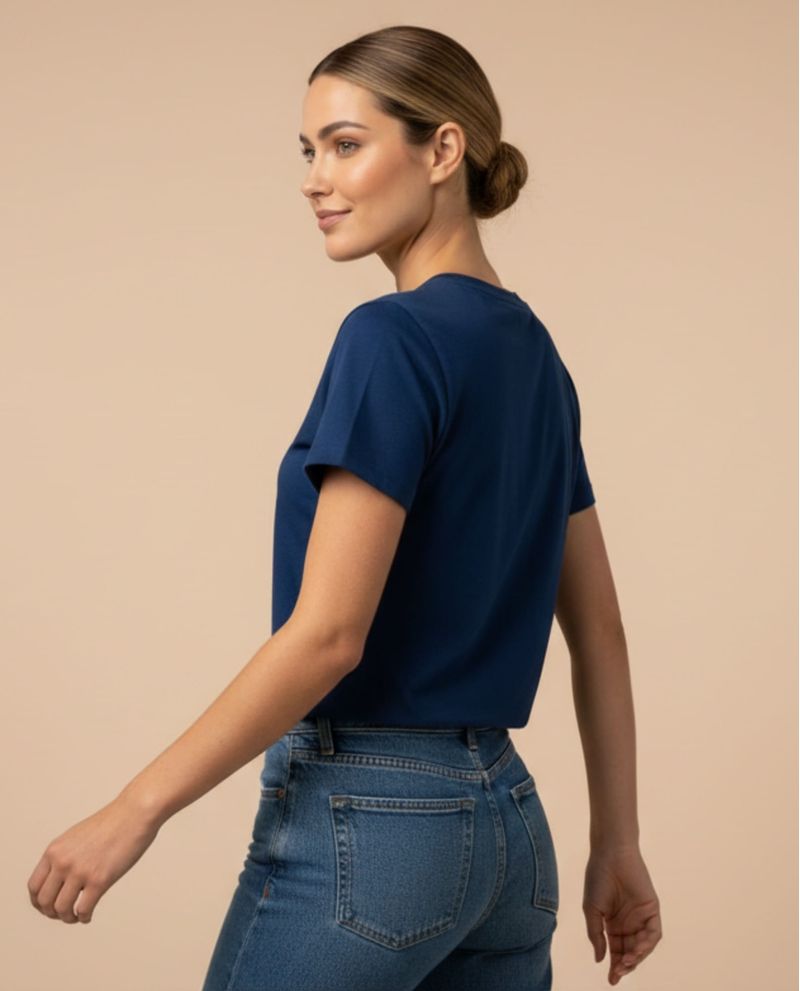 Camiseta azul oscuro con mensaje bordado en francés que aporta sofisticación sutil y personalidad distintiva. Su estampado romántico contrasta elegantemente con el corte regular clásico, mientras que las mangas cortas y el cuello redondo ofrecen comodidad durante todo el día. Funciona tanto para encuentros casuales como para contextos creativos profesionales donde se busca diferenciarse con estilo discreto pero memorable.