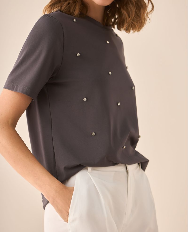 Hay básicas que van más allá, como esta, que además de su diseño clásico de manga corta y cuello redondo, cuenta con apliques brillantes que te harán destacar en cada evento, dándole a tus looks ese plus que necesitas, sin restarle comodidad a tus días más ajetreados. Porque en Esprit creemos que los detalles sí importan, esta prenda es más que una camiseta.
