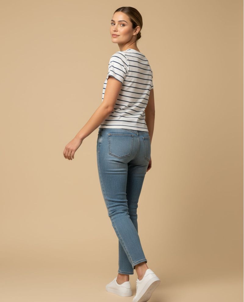 Para looks casuales, combínala con jeans straight y zapatillas deportivas, añadiendo una chaqueta denim como tercera capa. En contextos de trabajo informal, úsala con pantalones chinos y un cardigan abierto, completando con mocasines. Para planes nocturnos, túcala dentro de una falda midi con blazer y tacones medianos.