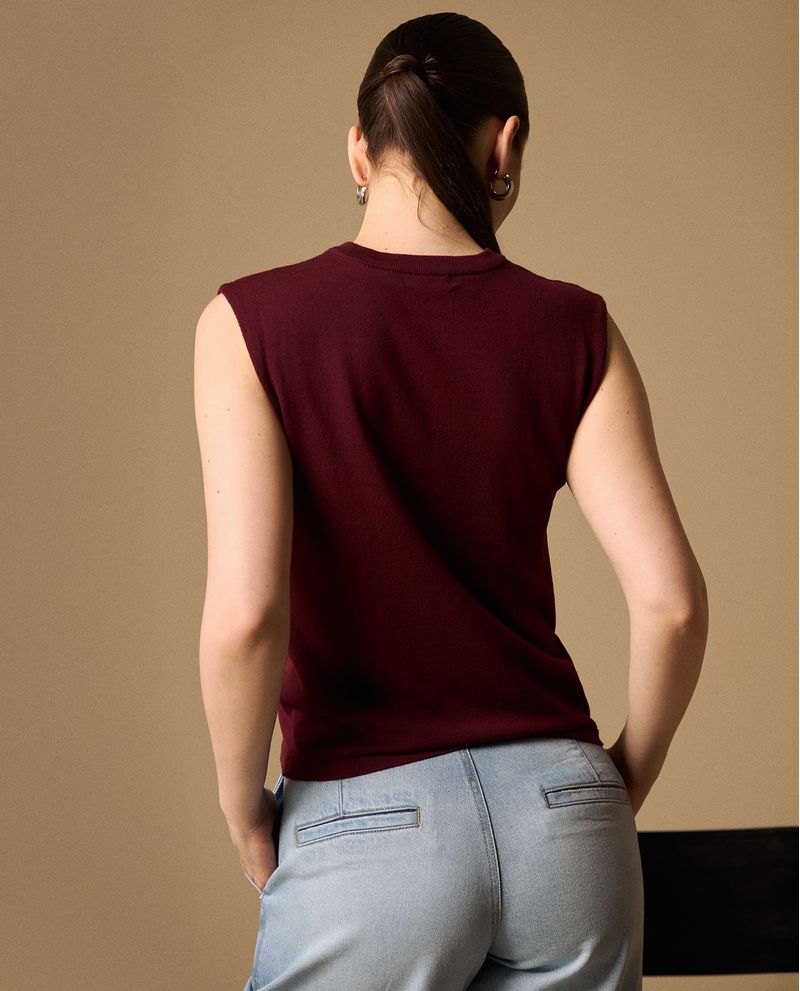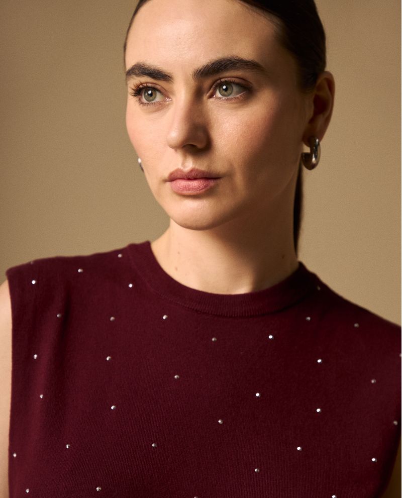Camiseta morado oscuro sin mangas con pequeñas aplicaciones brillantes que aportan un toque especial a tus básicos. Su tejido de punto suave se adapta cómodamente al cuerpo, mientras que el cuello redondo y las sisas bien acabadas garantizan un ajuste impecable. Ideal para combinar en capas o usar sola en ocasiones casuales elegantes.
