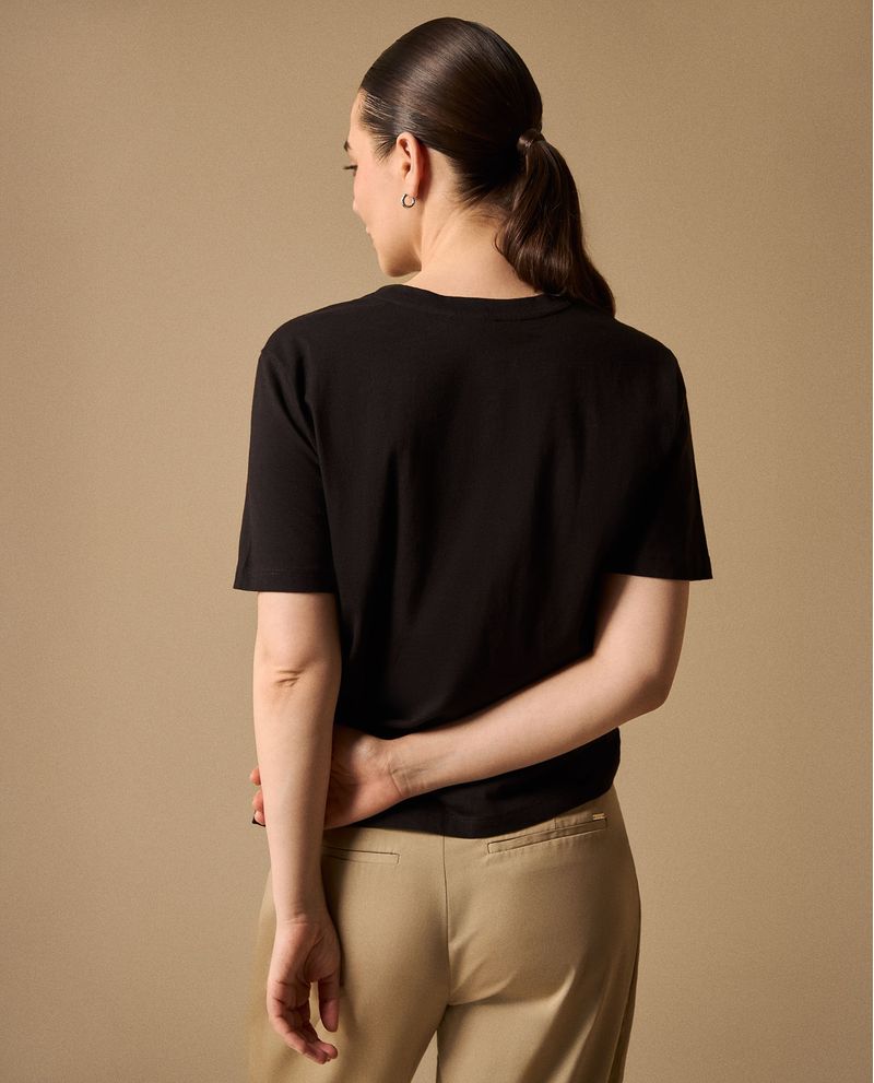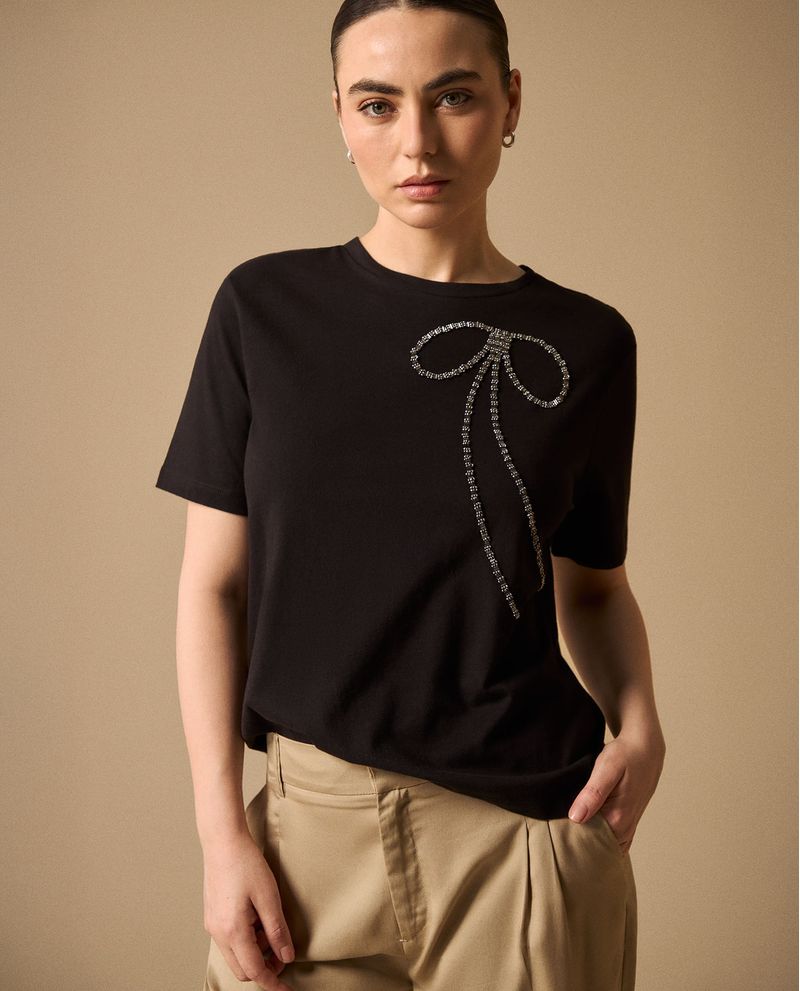 Camiseta negra con aplicación de strass formando un lazo decorativo que aporta sofisticación a tu look básico. Su tejido de algodón premium garantiza comodidad durante todo el día, mientras que el detalle brillante añade ese toque especial que marca la diferencia. Ideal para combinar con pantalones de vestir en la oficina o jeans para un casual elegante, esta pieza se adapta a múltiples ocasiones manteniendo siempre un aire refinado.