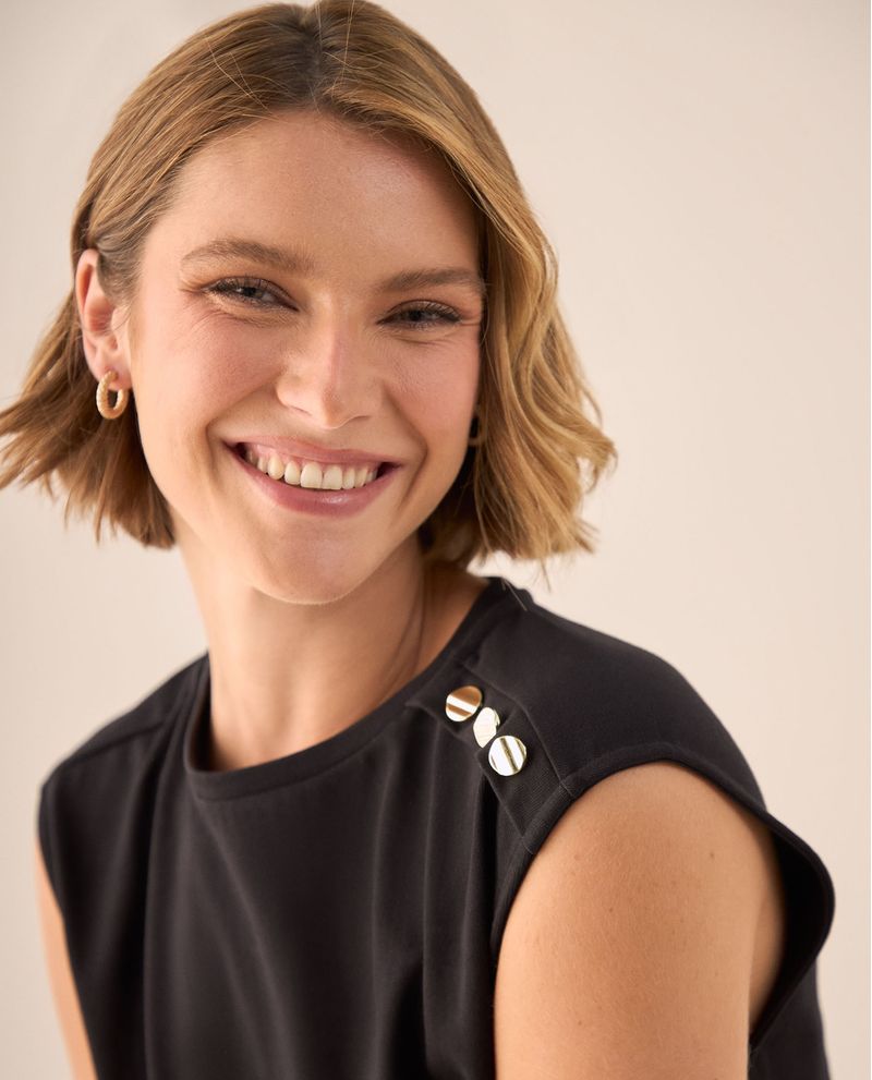 Para un look casual chic, combínala con jeans de tiro alto y una chaqueta denim ligera. Los botones dorados hacen eco con accesorios metálicos como aretes pequeños y un reloj delicado. Para elevar el conjunto, intercambia los jeans por pantalones de lino y añade un blazer estructurado, completando con sandalias de tacón bajo y un bolso de cuero en tonos neutros.