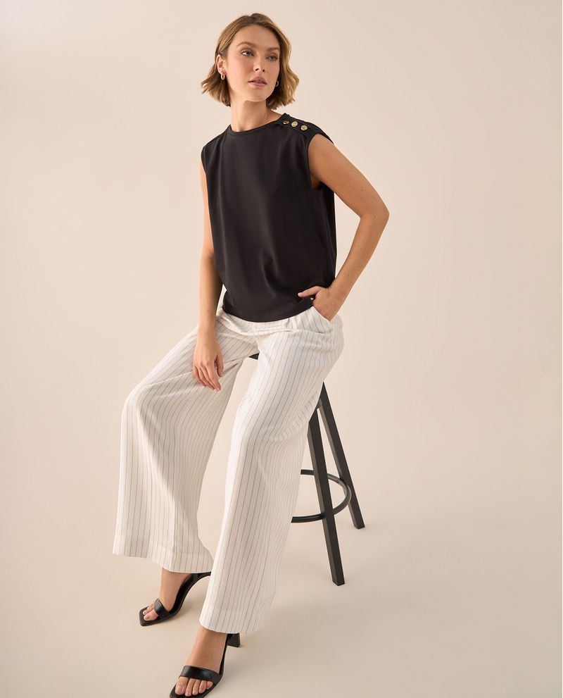 Camiseta blanca con rayas negras y tres botones dorados que añaden sofisticación a este básico atemporal. Su tejido de algodón-poliéster garantiza comodidad durante todo el día, mientras que el corte ligeramente oversized favorece múltiples siluetas. Ideal para crear looks casuales elegantes desde el café matutino hasta la cena con amigas.